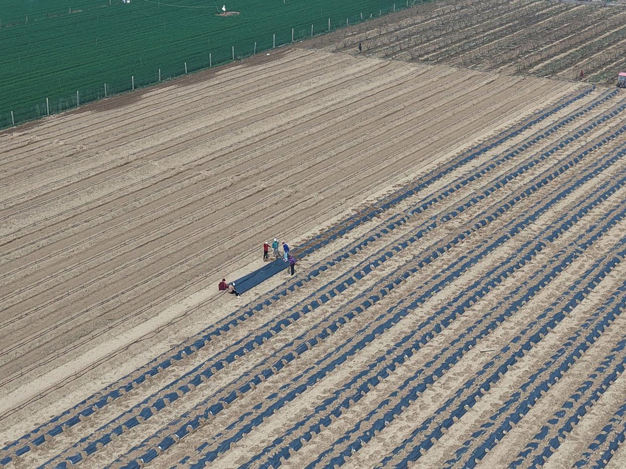 3月28日,河南省焦作市温县黄河街道东张王庄村村民在田间覆盖地膜(无人机照片)。 新华社发(徐宏星 摄)