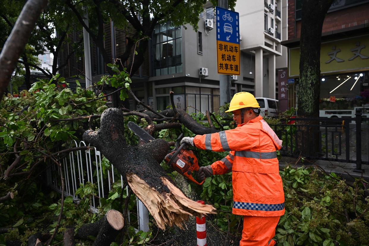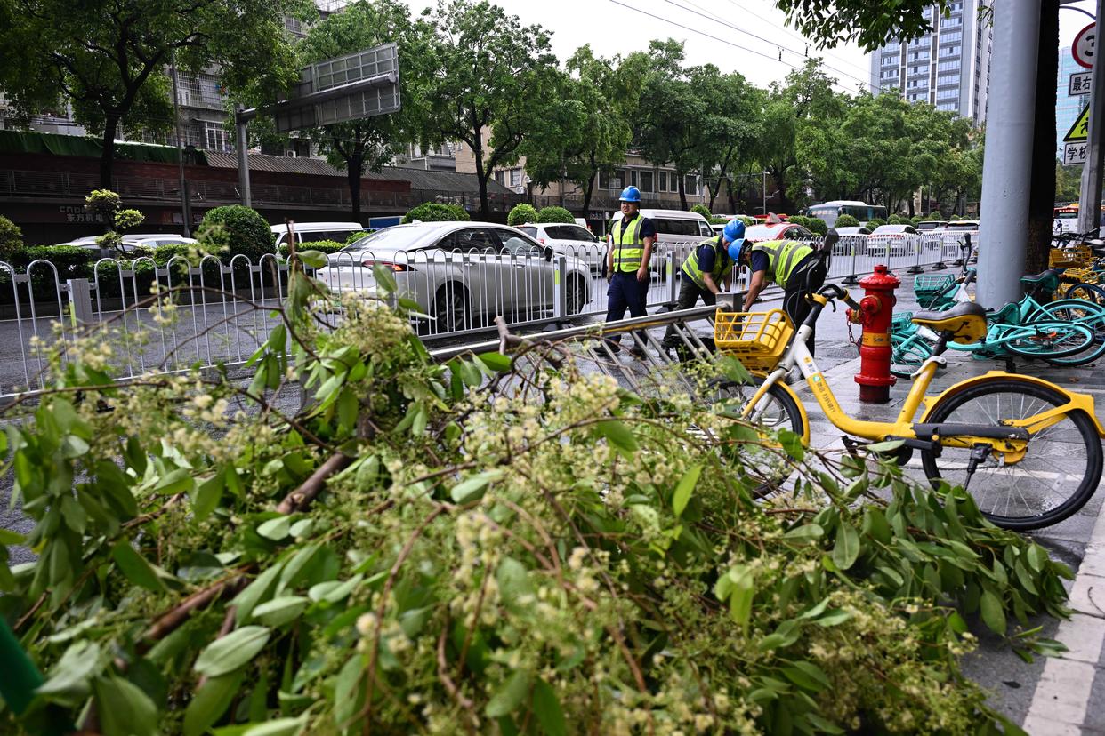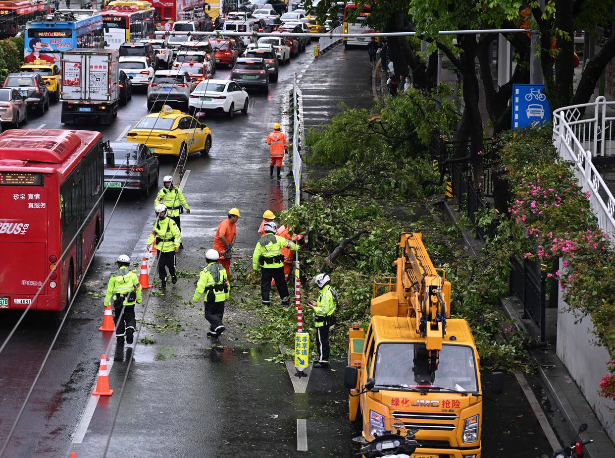3月30日,在广州市越秀区解放中路,工作人员在清理倒伏树木。新华社记者 邓华 摄