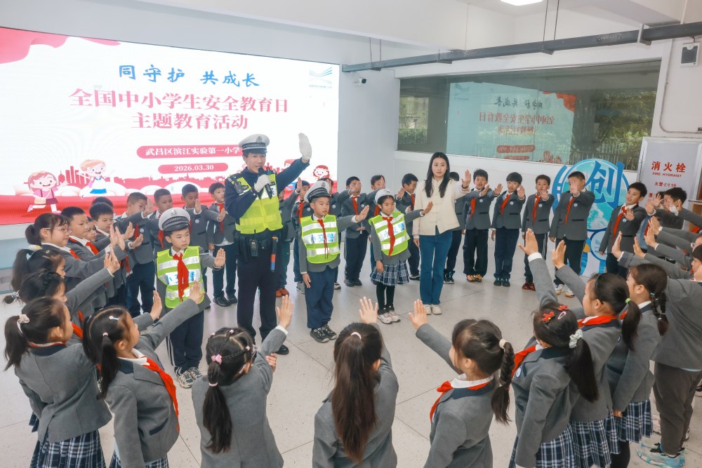 3月30日,在湖北省武汉市武昌区滨江实验第一小学,交警指导学生体验交通安全手势操。新华社发(赵军摄)