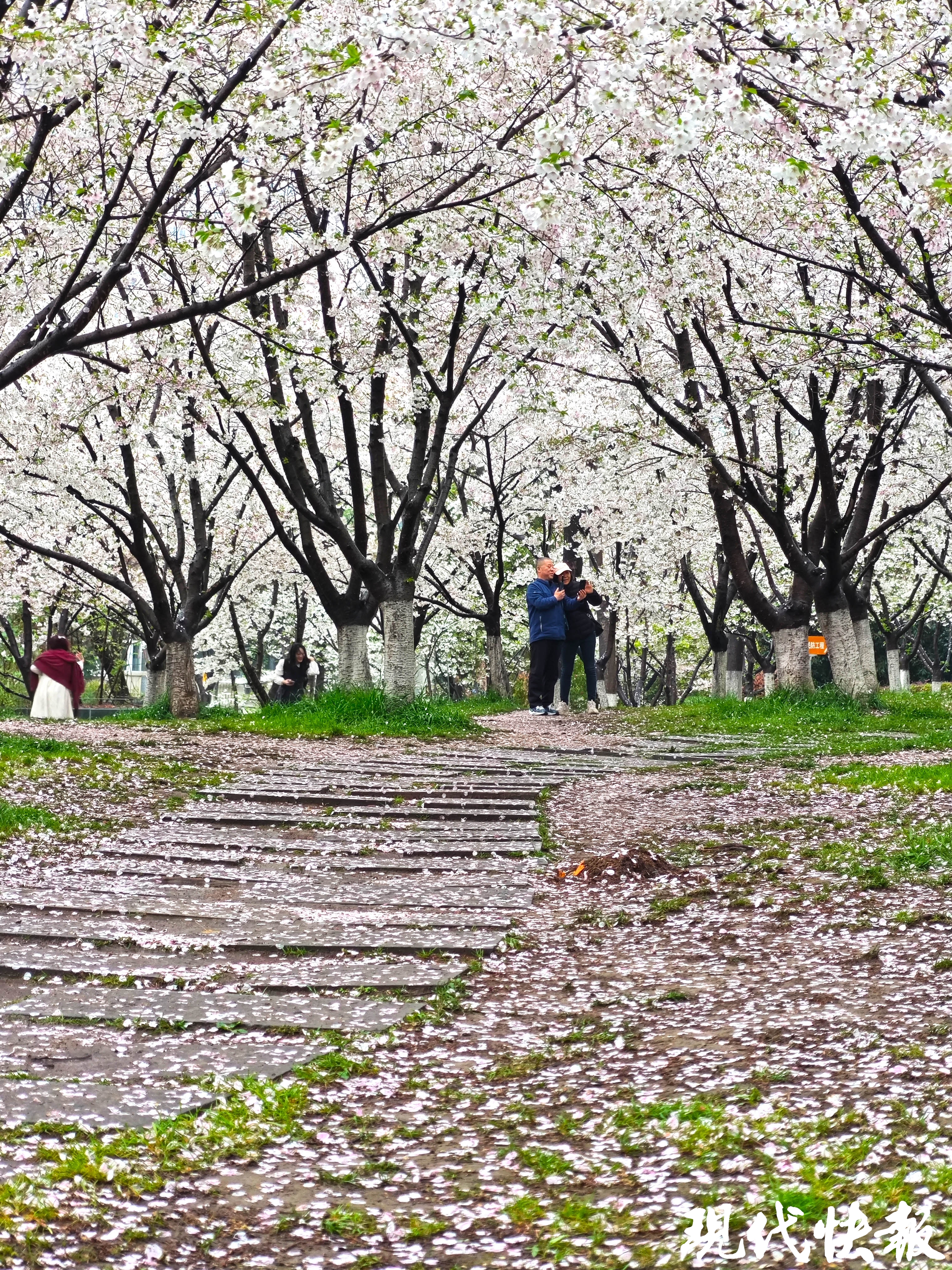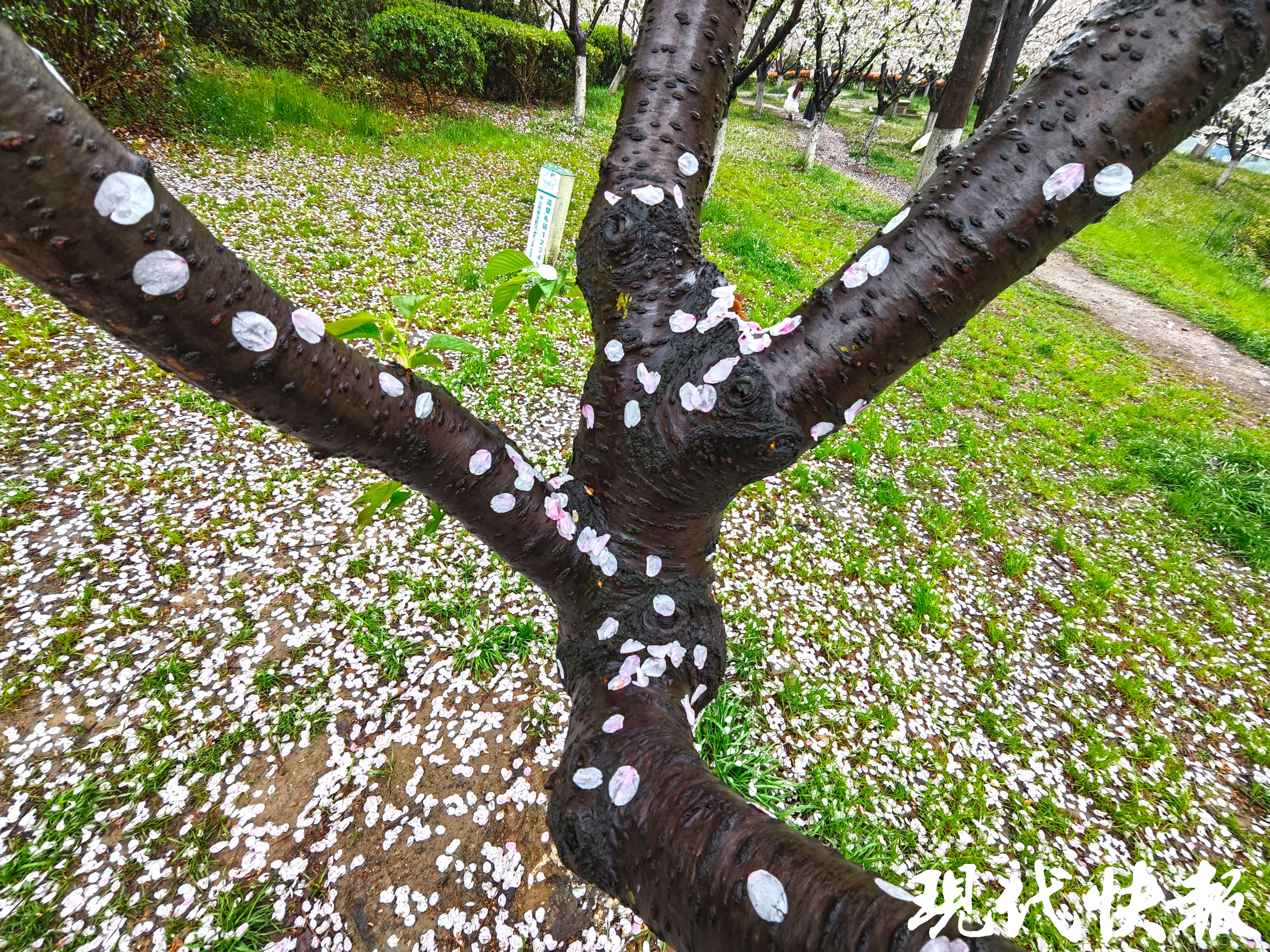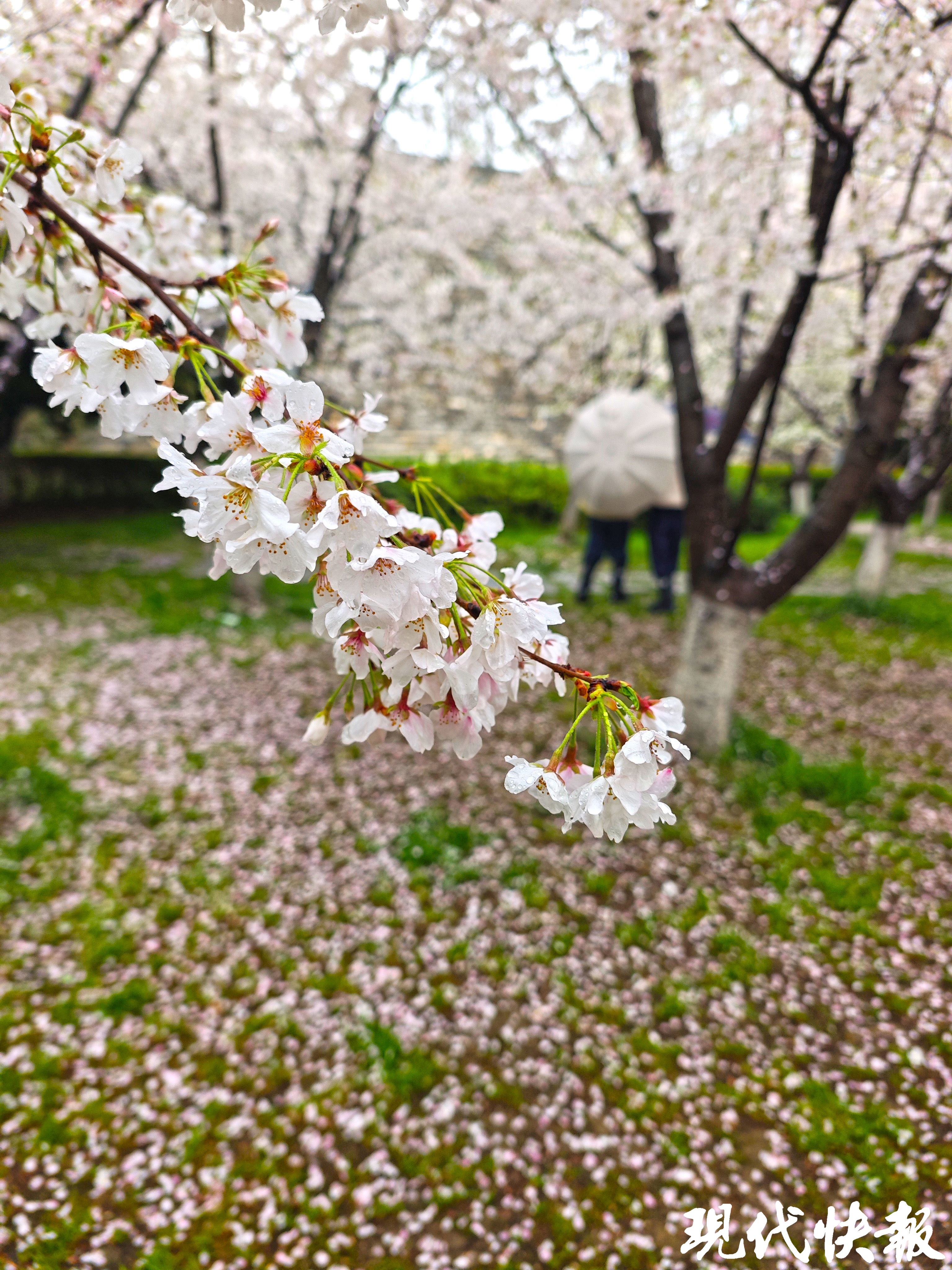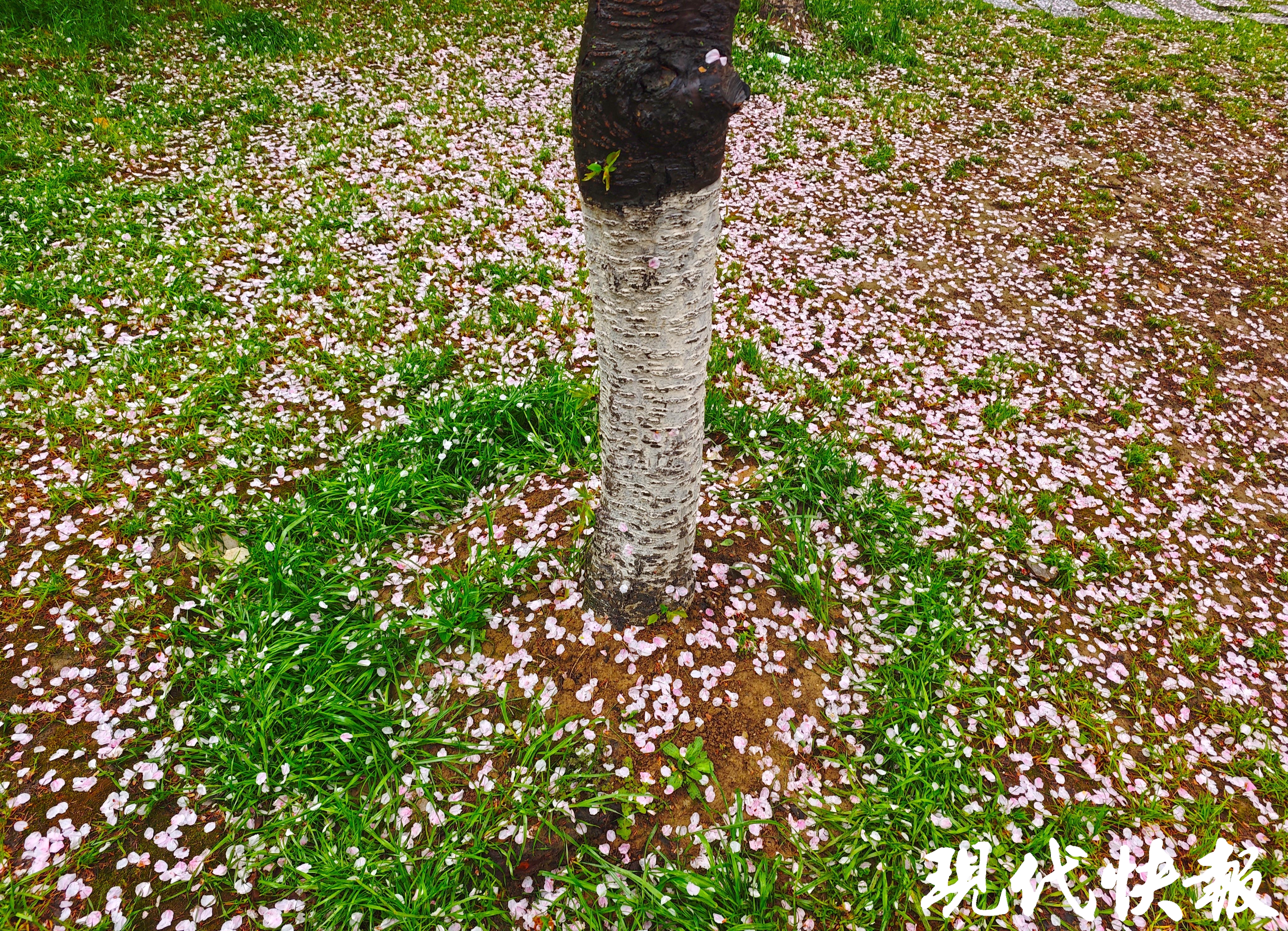 山石间、草地上、墙角边……枝头的粉白花瓣被风雨轻拂,铺就一地温柔,形成“落樱如雨”的唯美景致。