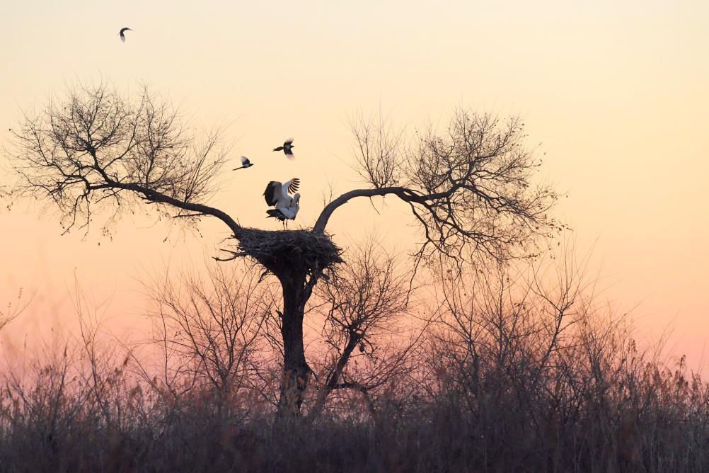 3月28日,在黑龙江省肇东市千鹤岛旅游风景区,夕阳下的东方白鹳在巢中休息(无人机照片)。新华社发(刘大鹏 摄)