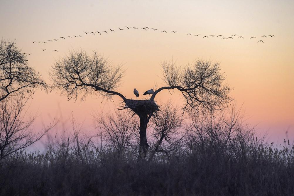 3月28日,在黑龙江省齐齐哈尔市克钦湖湿地,一行大雁在东方白鹳巢上空飞过。新华社发(王勇刚 摄)