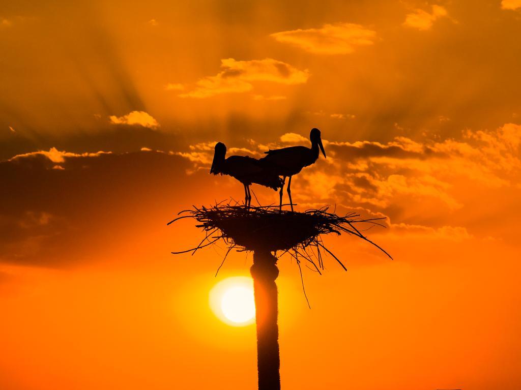 3月29日,在黑龙江省肇东市千鹤岛旅游风景区,夕阳下的东方白鹳在巢中休息(无人机照片)。新华社发(刘大鹏 摄)