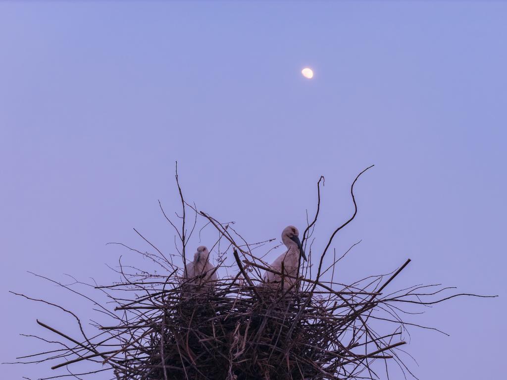 3月28日,在黑龙江省肇东市千鹤岛旅游风景区,月色下的东方白鹳在巢中休息(无人机照片)。新华社发(刘大鹏 摄)
