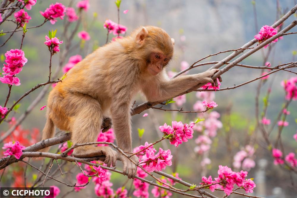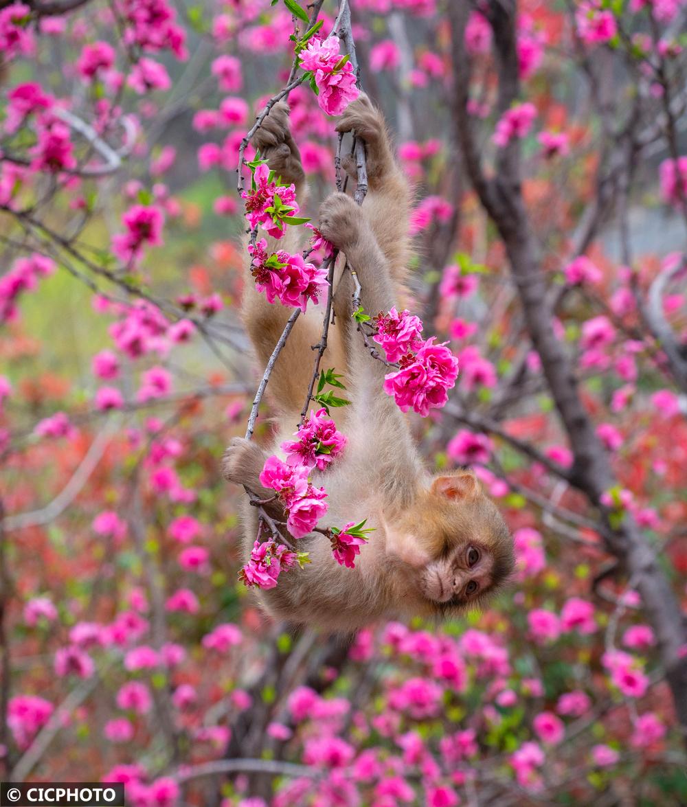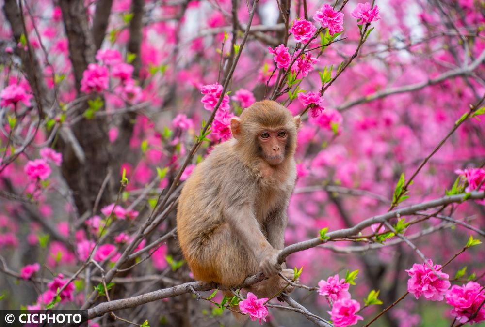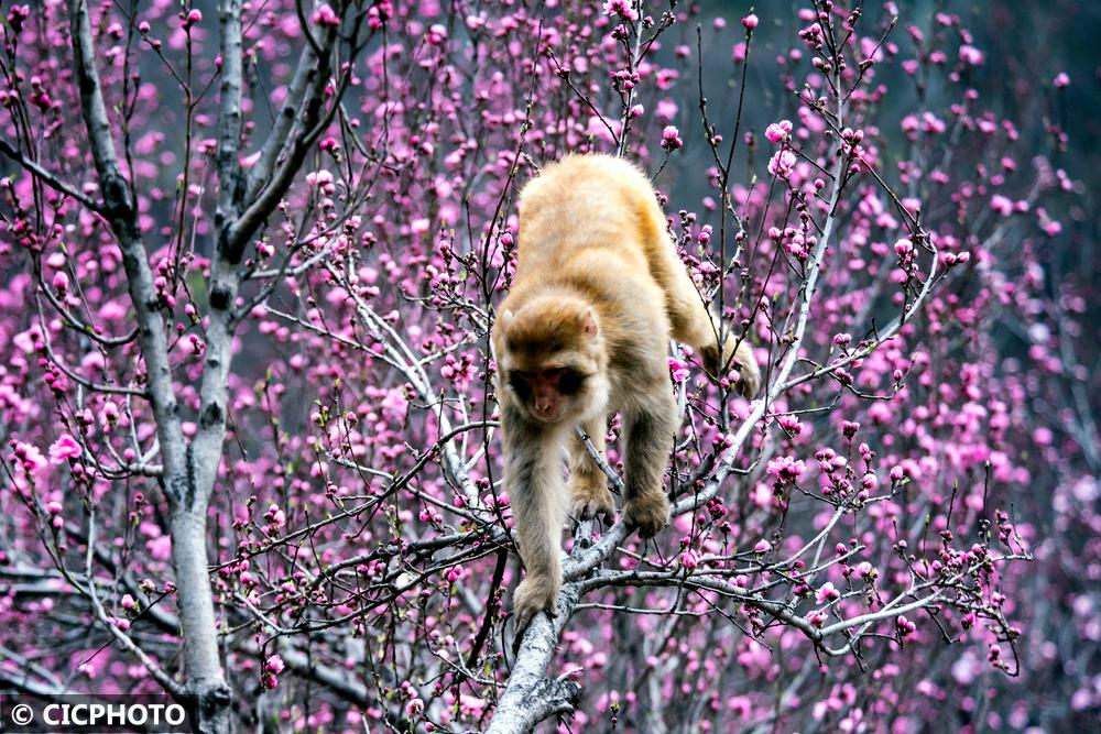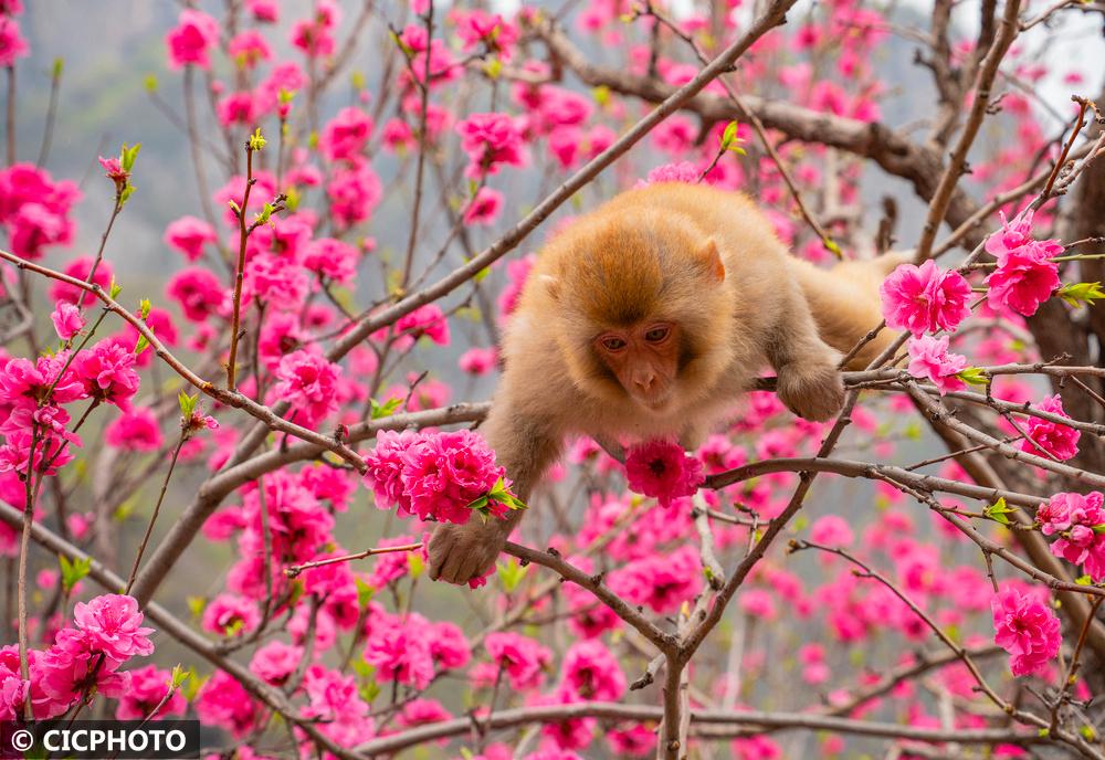 河南省济源市五龙口风景区地处河南太行山猕猴国家级自然保护区内。春暖花开的时节,太行猕猴在花丛间嬉戏、觅食,享受美好春光。