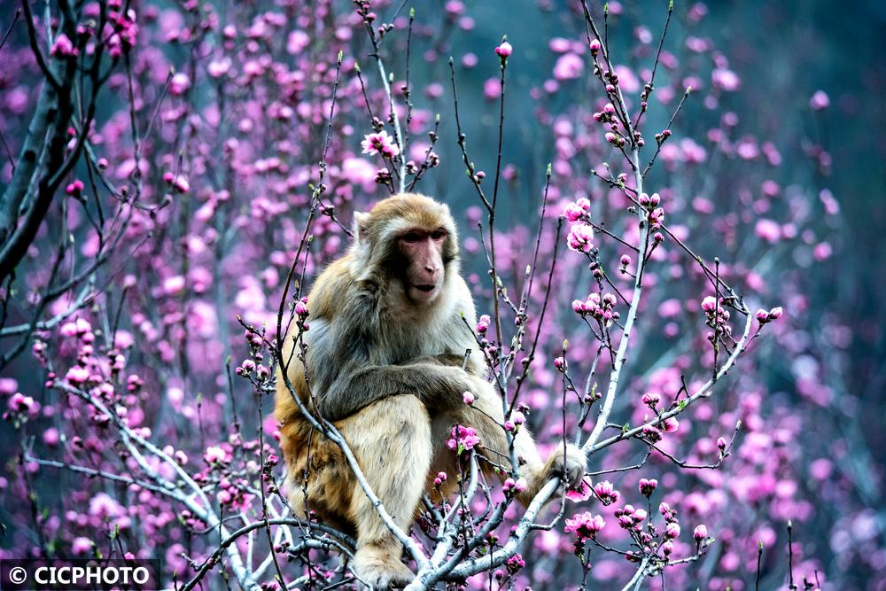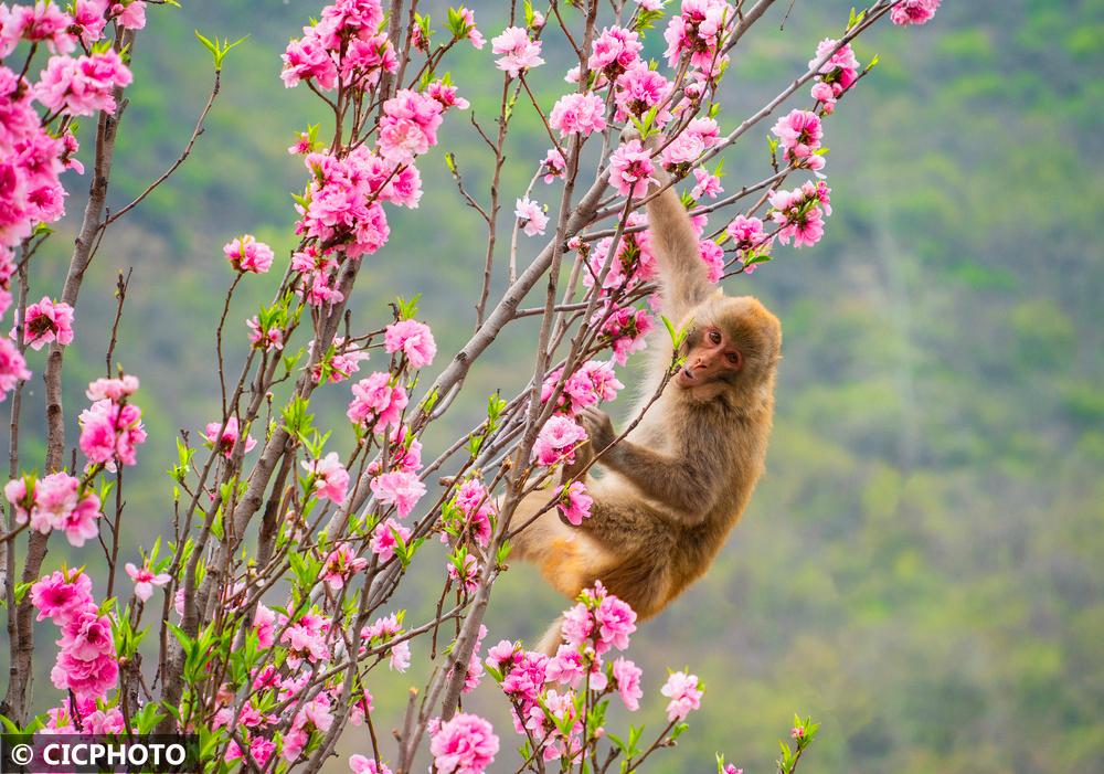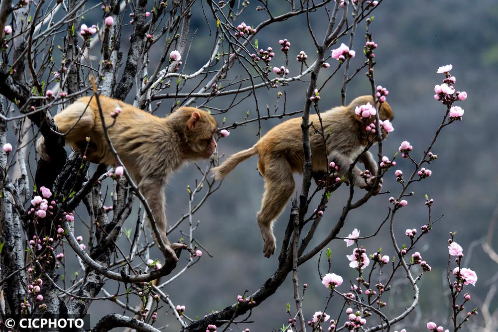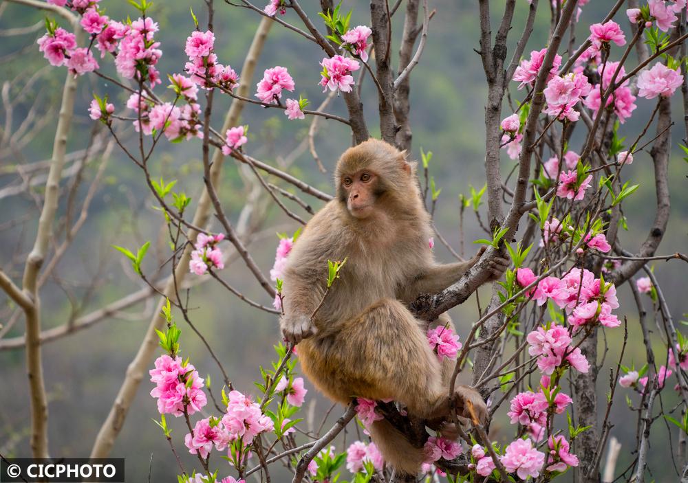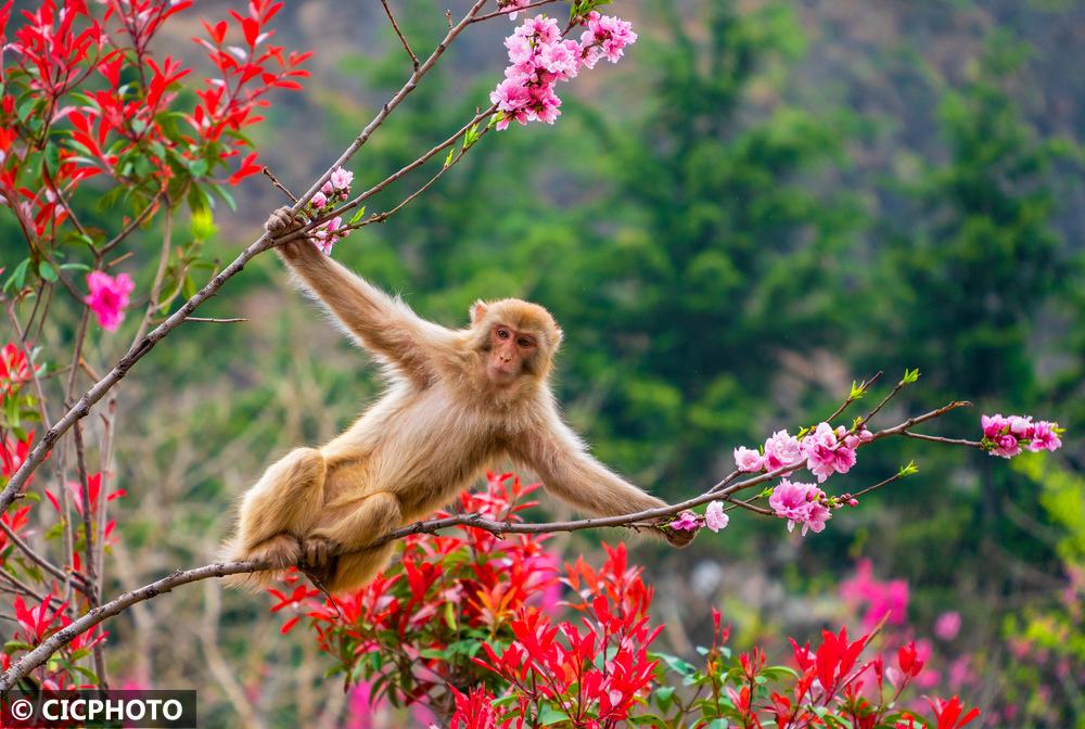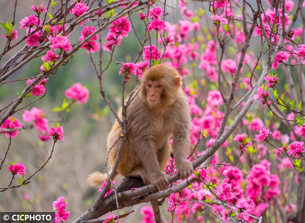 河南省济源市五龙口风景区地处河南太行山猕猴国家级自然保护区内。春暖花开的时节,太行猕猴在花丛间嬉戏、觅食,享受美好春光。