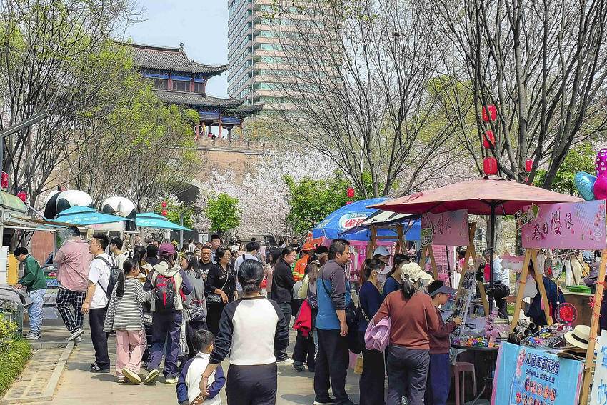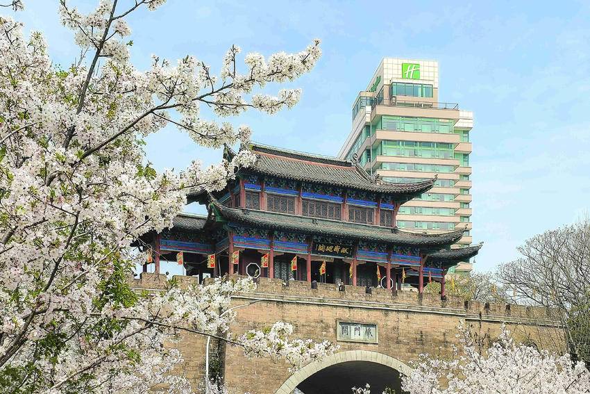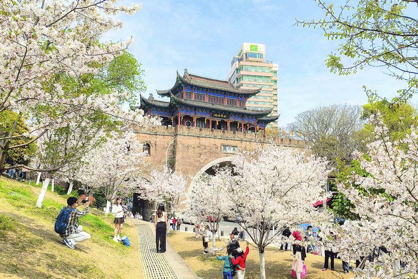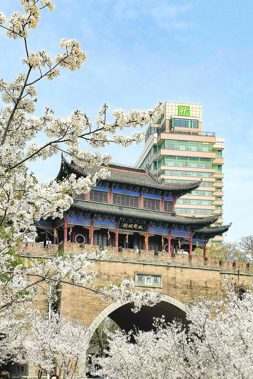 花影、古关、高楼,视线自然地从烂漫春光过渡到历史的厚重,再延伸至城市的现代气象。三种意象层叠交错,樱花做前景柔化了古关的硬朗,而晴川饭店的挺拔身姿又为这幅古典画卷添上了时代的一笔,正是武汉这座城市“古今交融”最生动的写照。