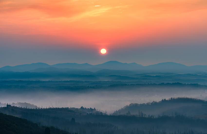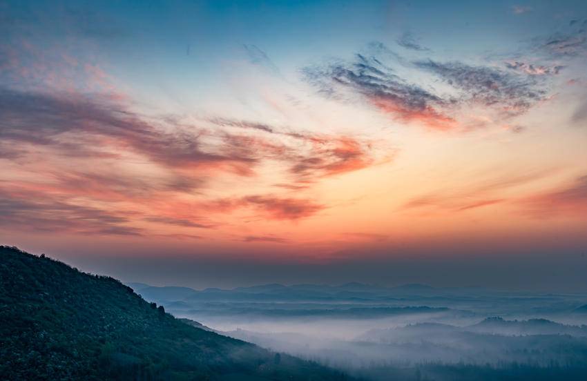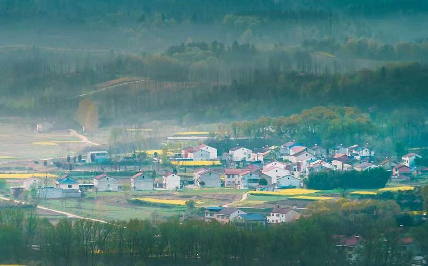雾气在村舍上空蒸腾,和生机盎然的树林、亮白的公路缠缠绕绕,风一吹就漾开去,把整个村子都托在了云海里,像极了藏在山野里的世外桃源。