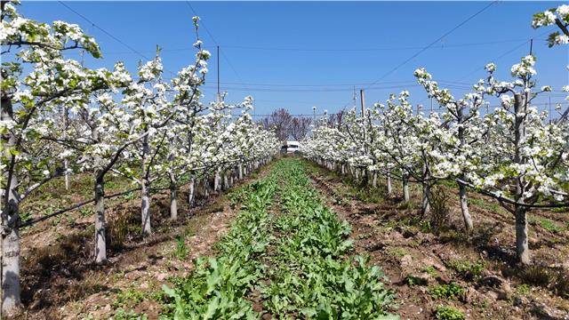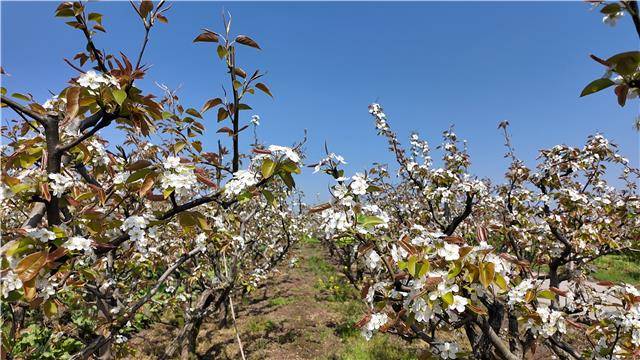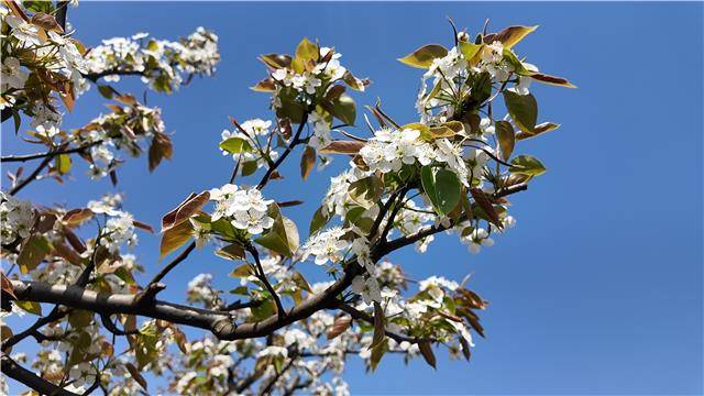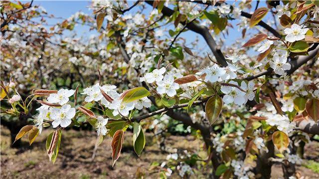 一树树梨花堆云叠雪,沿江铺展,五瓣成一朵,千朵压一树,素雅的花瓣在阳光下透出微光。微风拂过,片片花瓣如雪花飞舞,为这个春天献上一场无声的“梨花雪”。