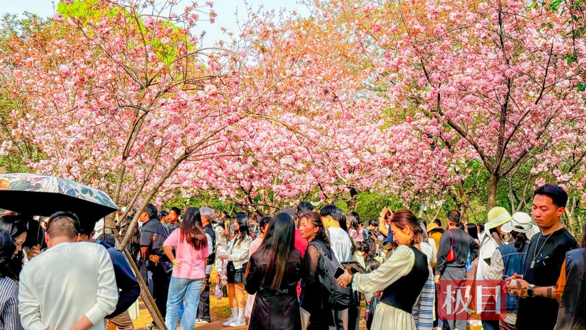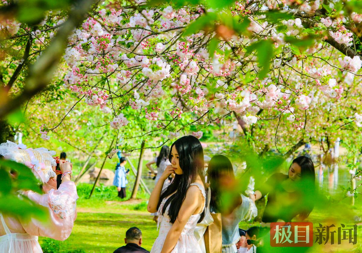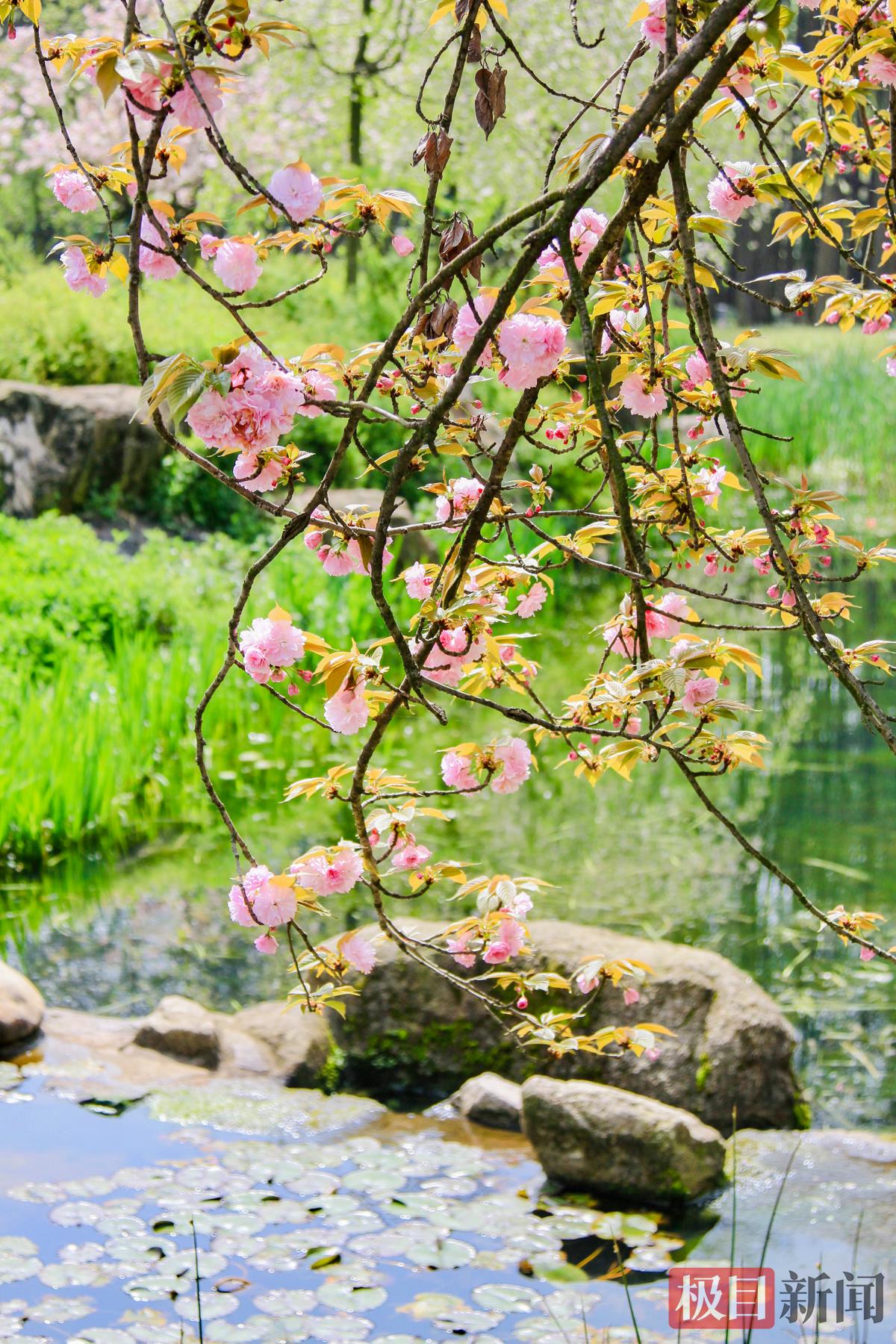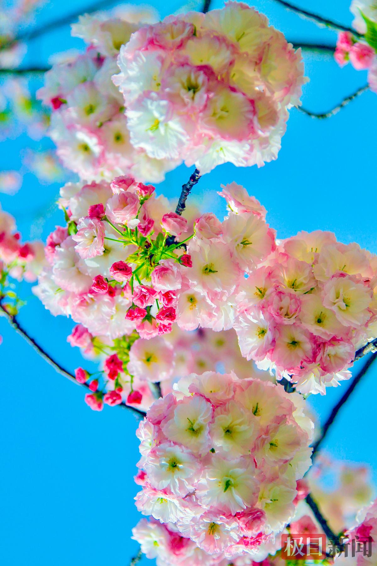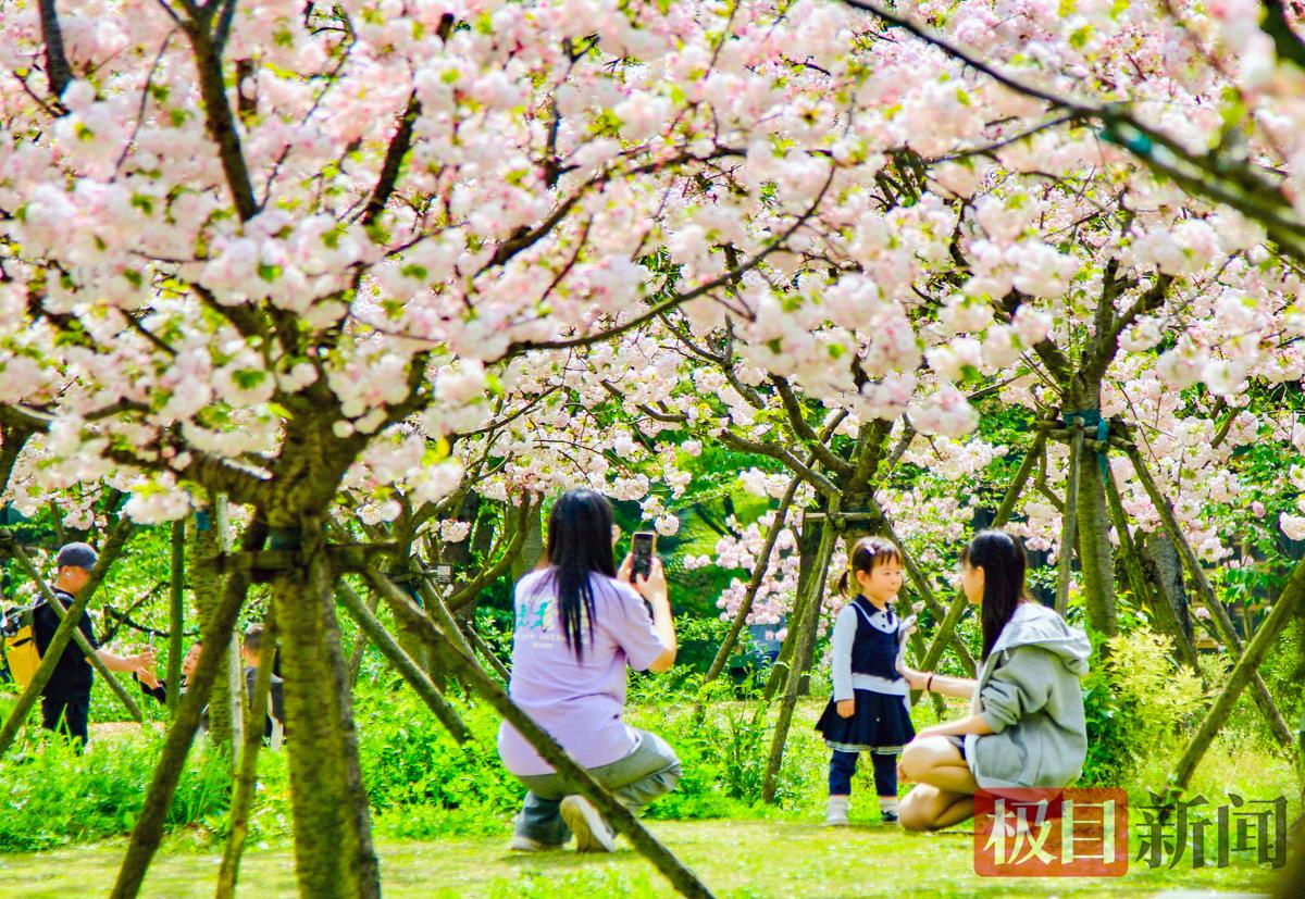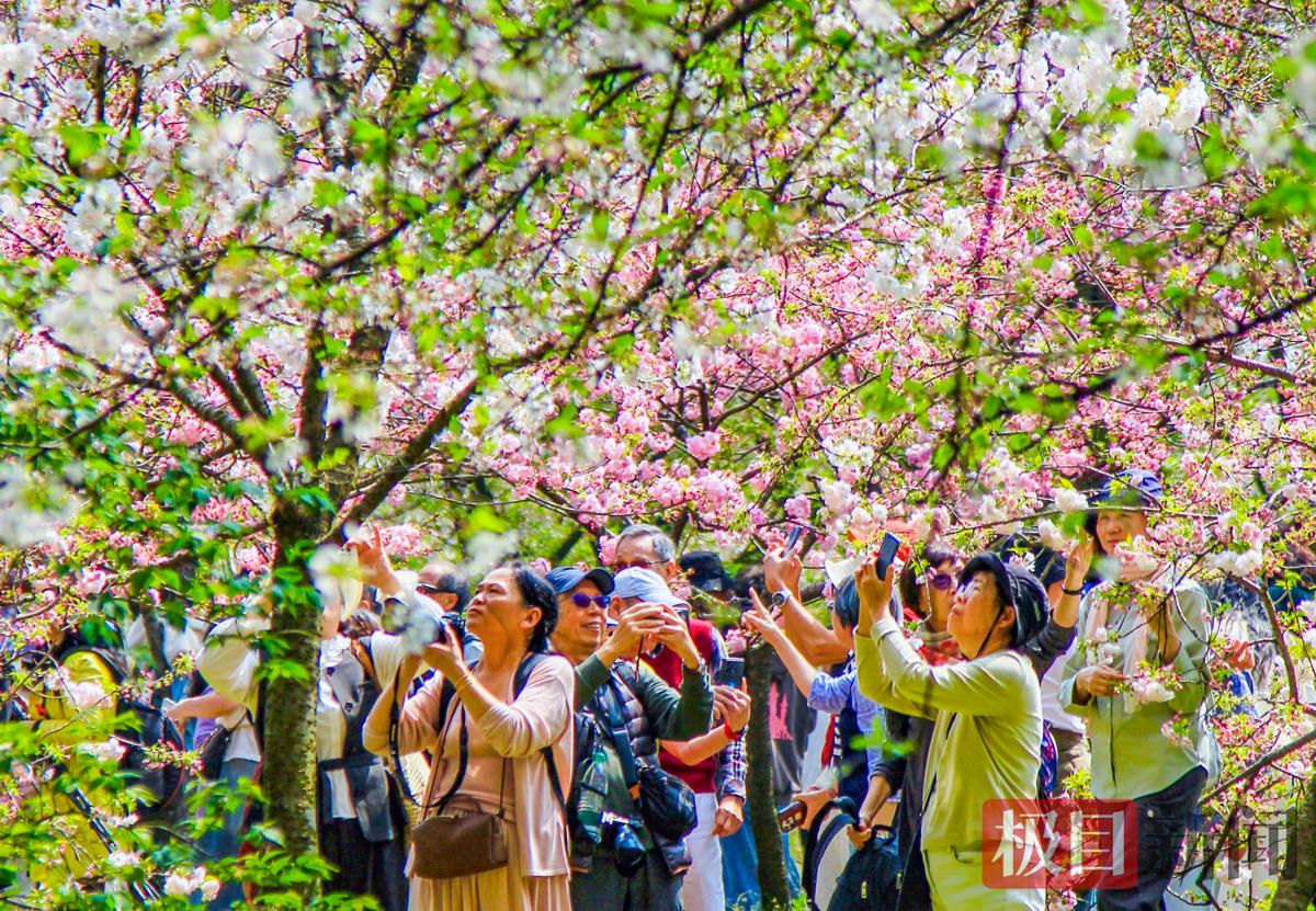 据悉,今年樱花季,东湖樱园新增了15个樱花品种,全园品种总数突破100种,并首次设立了“中国樱花品种区”。园内晚樱品种主要有太白、关山、松月、郁金、御衣黄、普贤象等,正值最佳观赏期。粉色、红色、白色和绿色等多种颜色的樱花重重叠叠,绚丽多彩,为江城春日再添浓墨重彩的一笔。