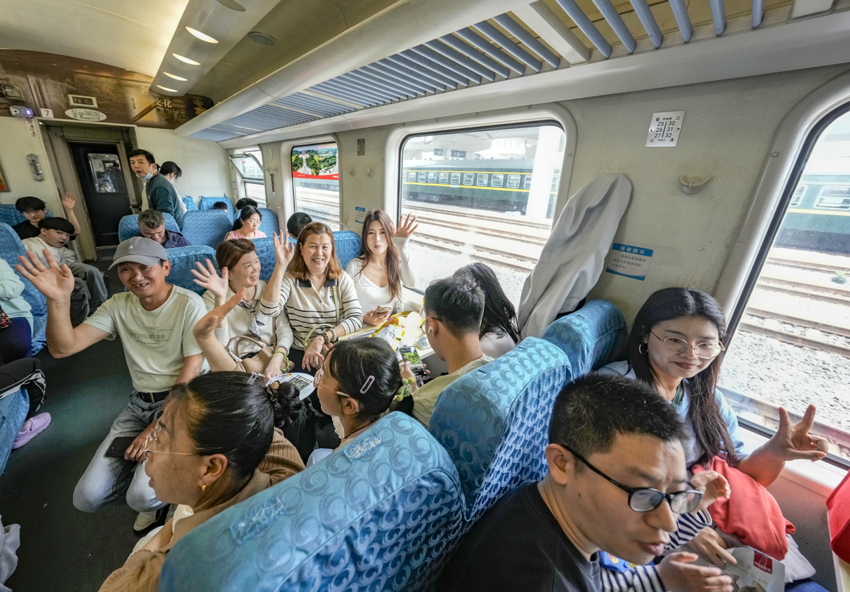 市民游客高兴乘火车环城游