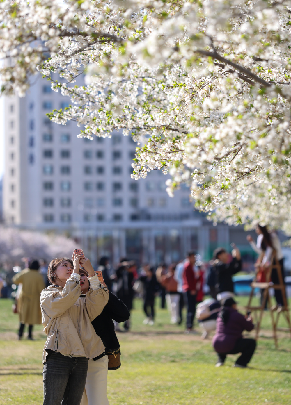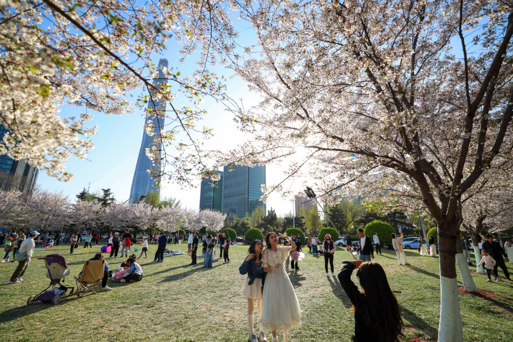 4月5日,市民在天津滨海新区泰达城市广场赏花。新华社记者 孙凡越 摄