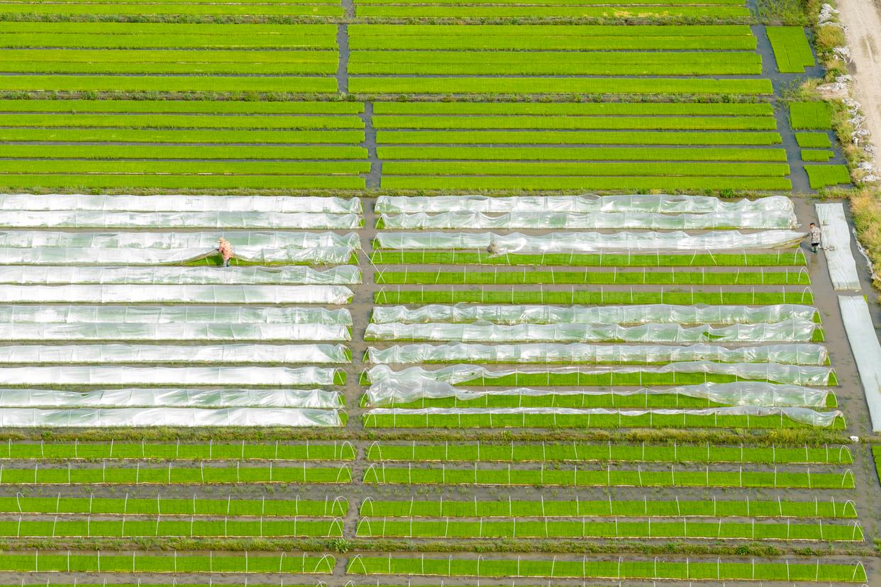 4月7日,浙江省余姚市黄家埠镇上塘村村民在田间劳作(无人机照片)。新华社发(张辉 摄)