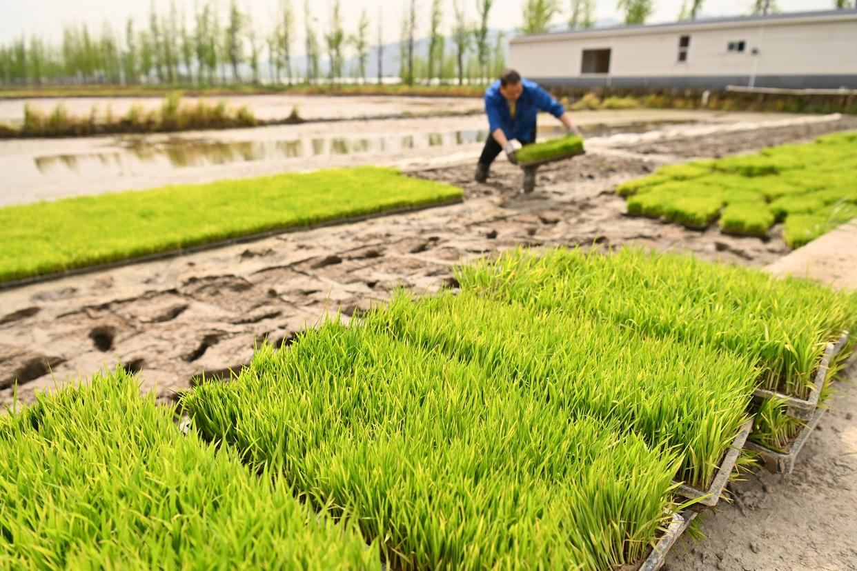 4月7日,浙江省东阳市城东街道寀卢村农户在准备用于插秧机种植的早稻。新华社发(包康轩 摄)