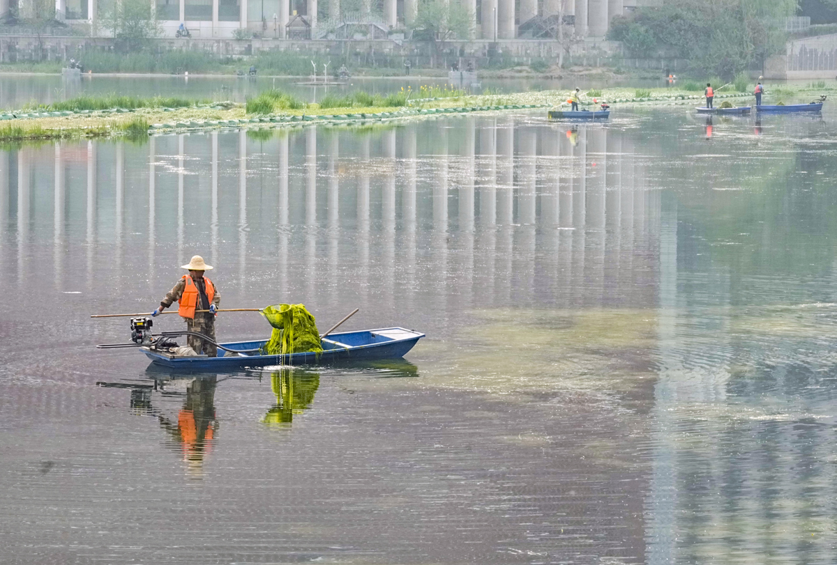 4月7日,多名水上清洁人员利用清理船,在武昌水果湖湖面上作业,打捞水中的绿藻。据悉,这是武汉市武昌区水务部门开展的绿藻专项清理行动。