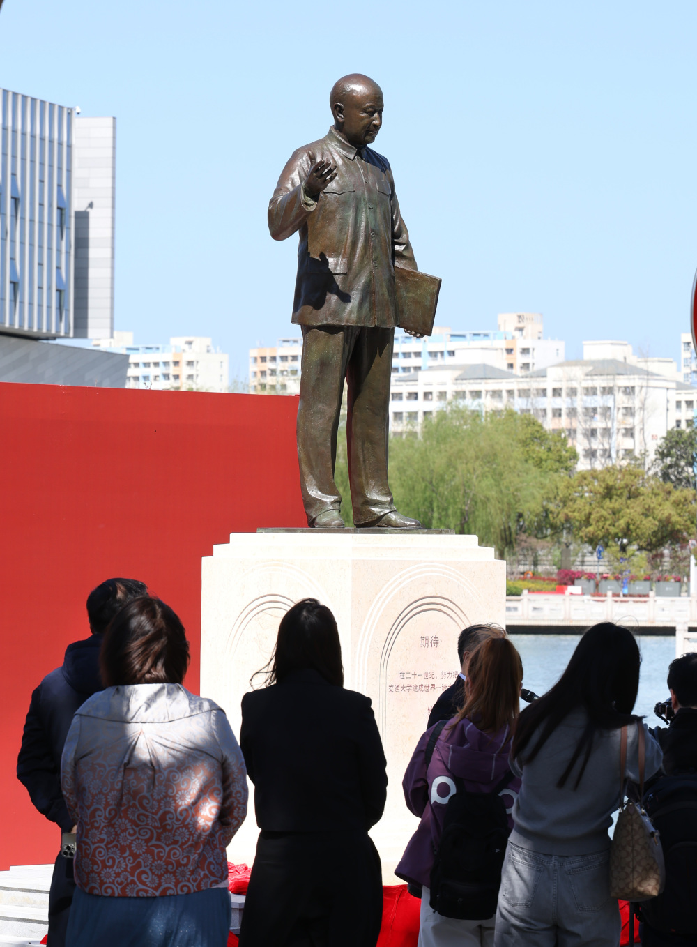 4月7日,钱学森主题雕塑《期待》在上海交通大学闵行校区涵泽湖畔正式落成。这尊雕塑为青铜材质,以钱学森晚年经典形象为蓝本,基座正面镌刻钱学森对母校的寄语。《国之所需 吾之所向——钱学森与上海交通大学》专题展同期亮相。展览通过丰富史料,串联起钱学森在交大奠定学术根基、点燃救国初心的求学岁月。