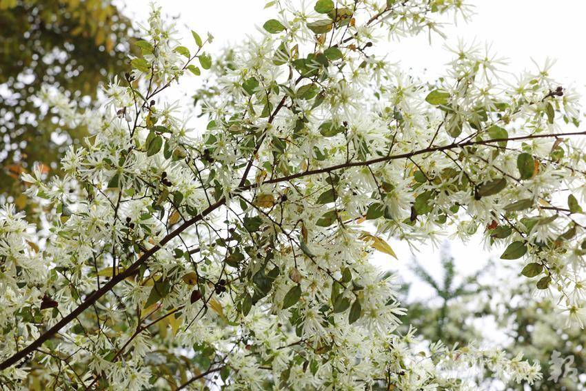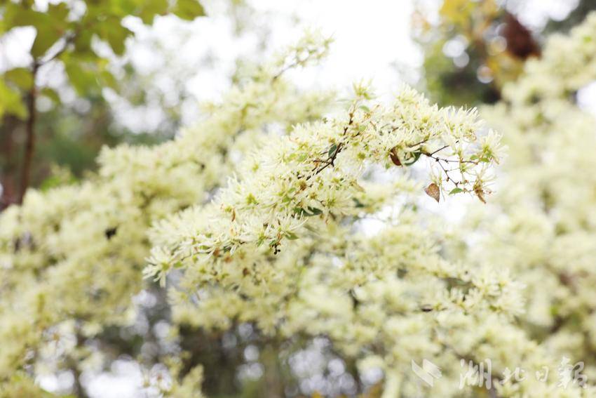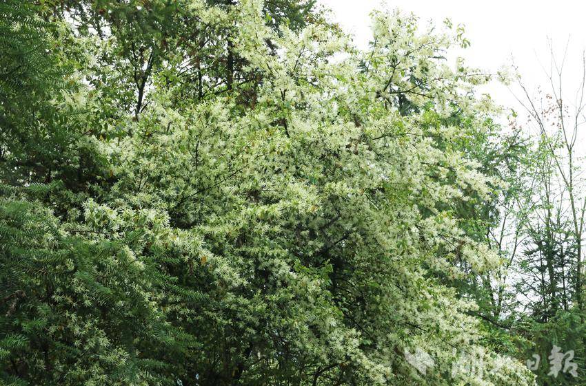 细密的花瓣似雪般轻盈、如雾般朦胧,又像灵动的流苏垂挂枝头,清风徐拂而过,花枝随风轻摇,细碎的花瓣簌簌飘落,淡淡的清香漫溢山间、沁人心脾,缓缓勾勒出一幅清新雅致、生机盎然的春日生态画卷。