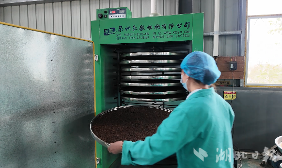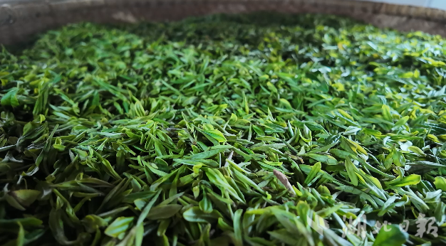 山上采摘正忙,山下加工火热。走进茶叶生产车间,机器轰鸣,一股清新醇厚的茶香扑面而来,沁人心脾。工人们各司其职、分工明确,依次完成分拣、摊青、杀青、回潮、理条、烘干、提香等工序,最终制成成品茶。随后,还要经过人工挑拣,剔除碎叶、杂质,确保每一批茶叶品质达标。湖北金鼓露毫茶叶有限公司生产车间现场负责人汤远友说:“我们每年采茶从3月20号开始到4月20号,今年的雨水比较好,现在正是生产的高峰期,我们每天收购鲜叶1200斤,产干茶280斤到300斤,预计今年要生产6000到7000斤干茶。”