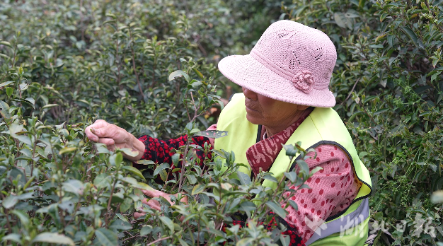 在刘集镇金鼓村的茶叶基地,茶树依山而种,层层叠叠铺展成一片绿色海洋。茶农们背着竹篓穿梭在整齐的茶垄间,指尖翻飞,熟练地采摘着鲜嫩绿芽。大悟县晶华茶叶销售农民专业合作社负责人郭华说:“现在是采摘春茶的旺季,我们这边固定工人每天有120多名女工在这里专业采茶,茶叶公司目前收购我们鲜叶的价格是每单斤90元。”