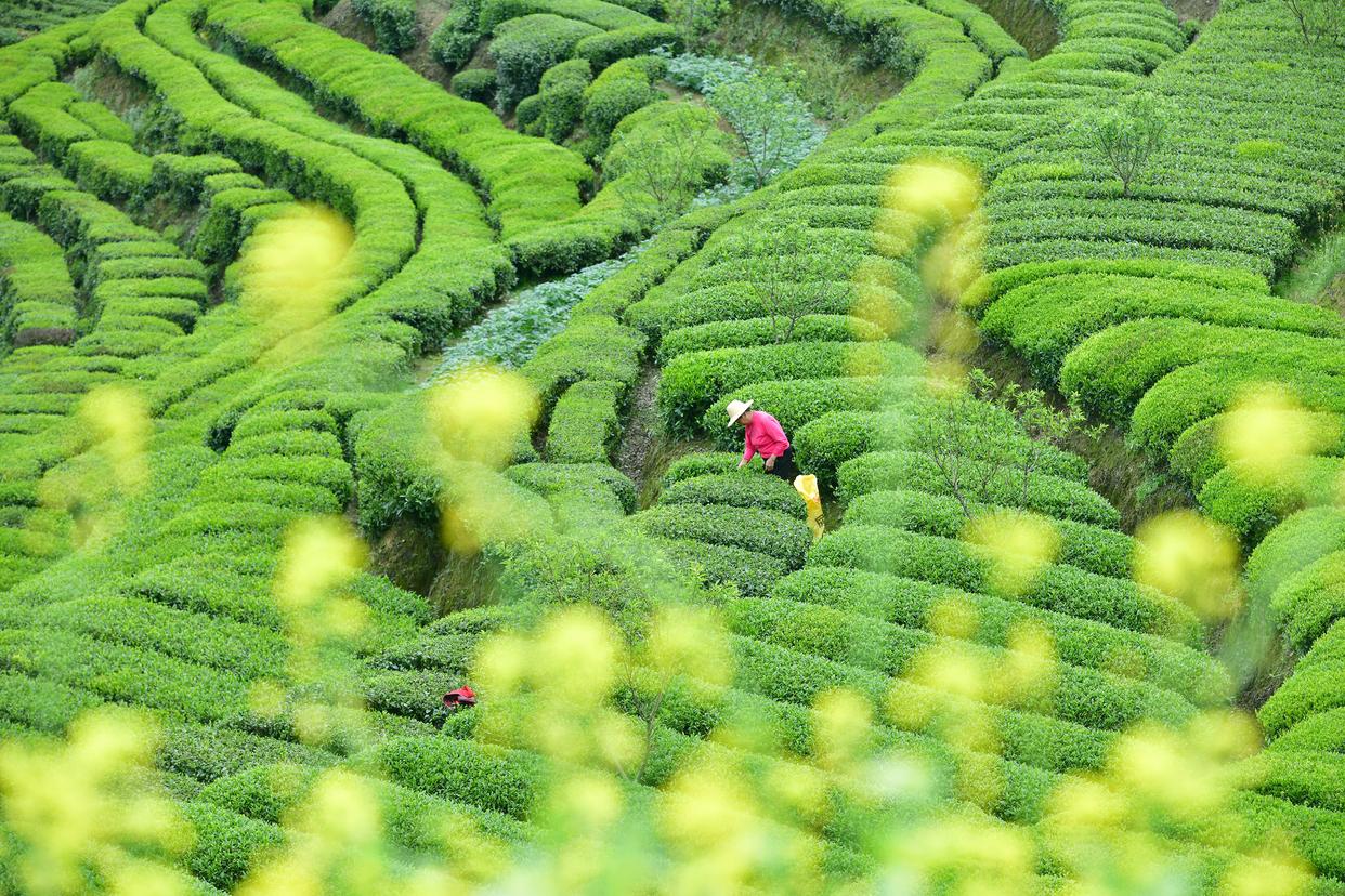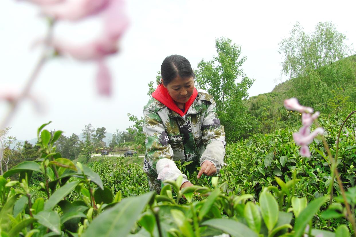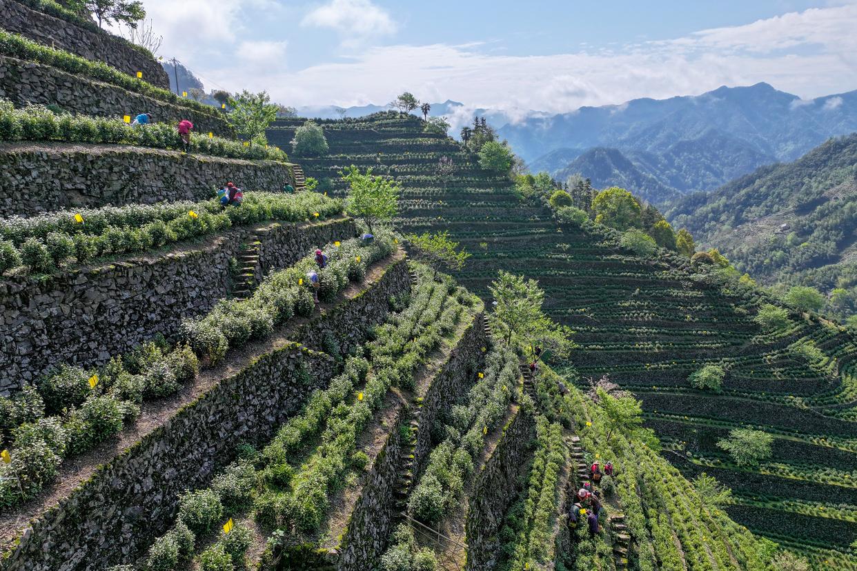 4月12日,茶农在三峡库区湖北省宜昌市秭归县茅坪镇长岭村一生态茶园采摘春茶。新华社发(王辉富摄)