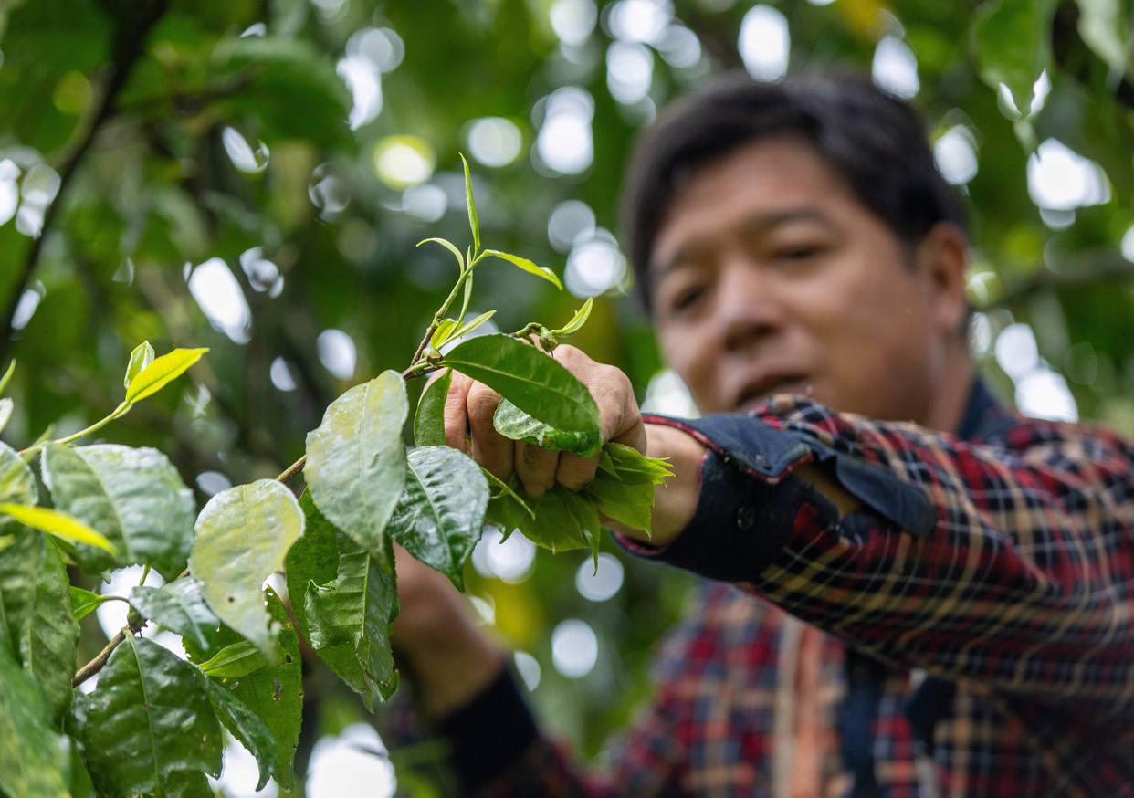 4月11日,重庆市南川区德隆镇茶树村,茶农在古茶树上细心挑选优质茶芽。新华社发(罗川摄)