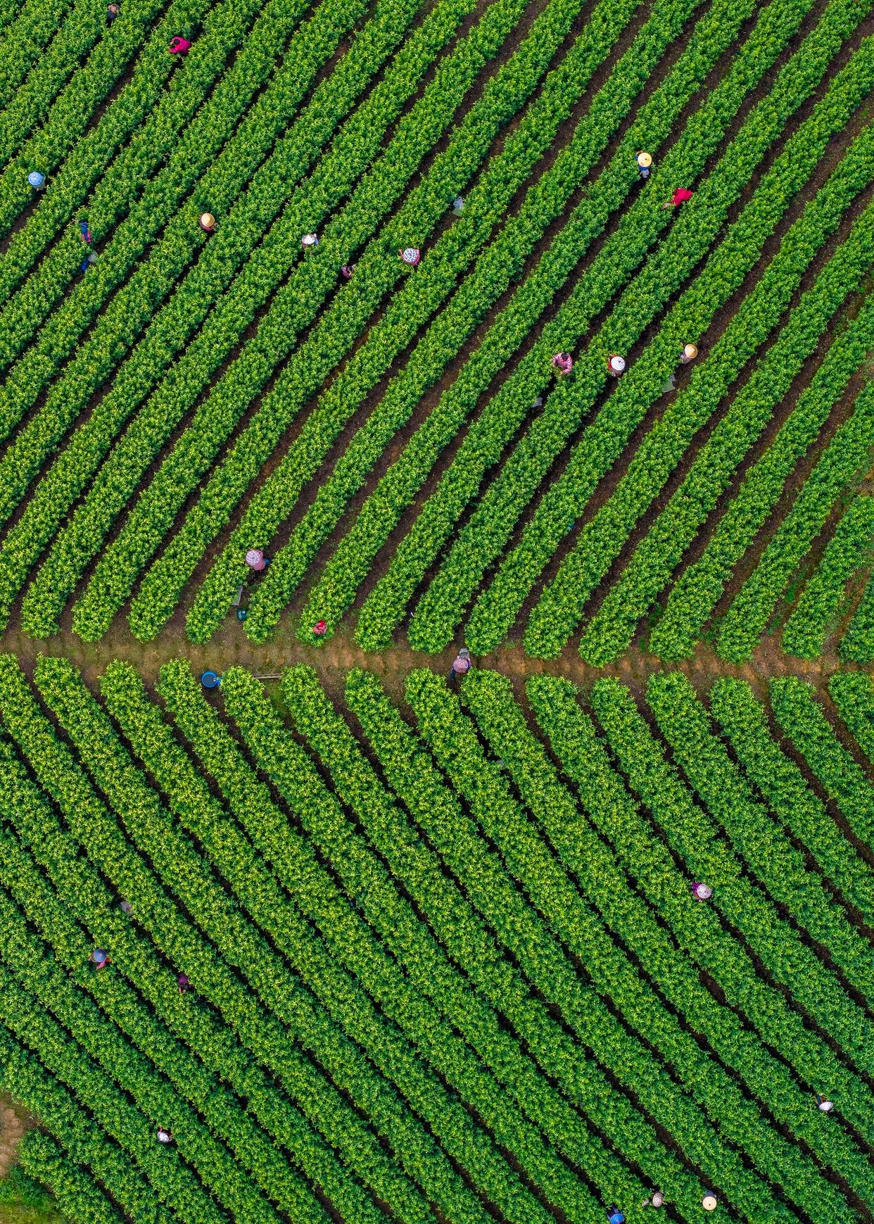 4月11日,采茶工在浙江省余姚市兰江街道茶园采摘茶叶(无人机照片)。新华社发(张辉摄)