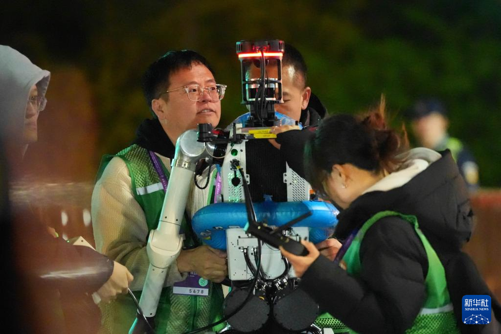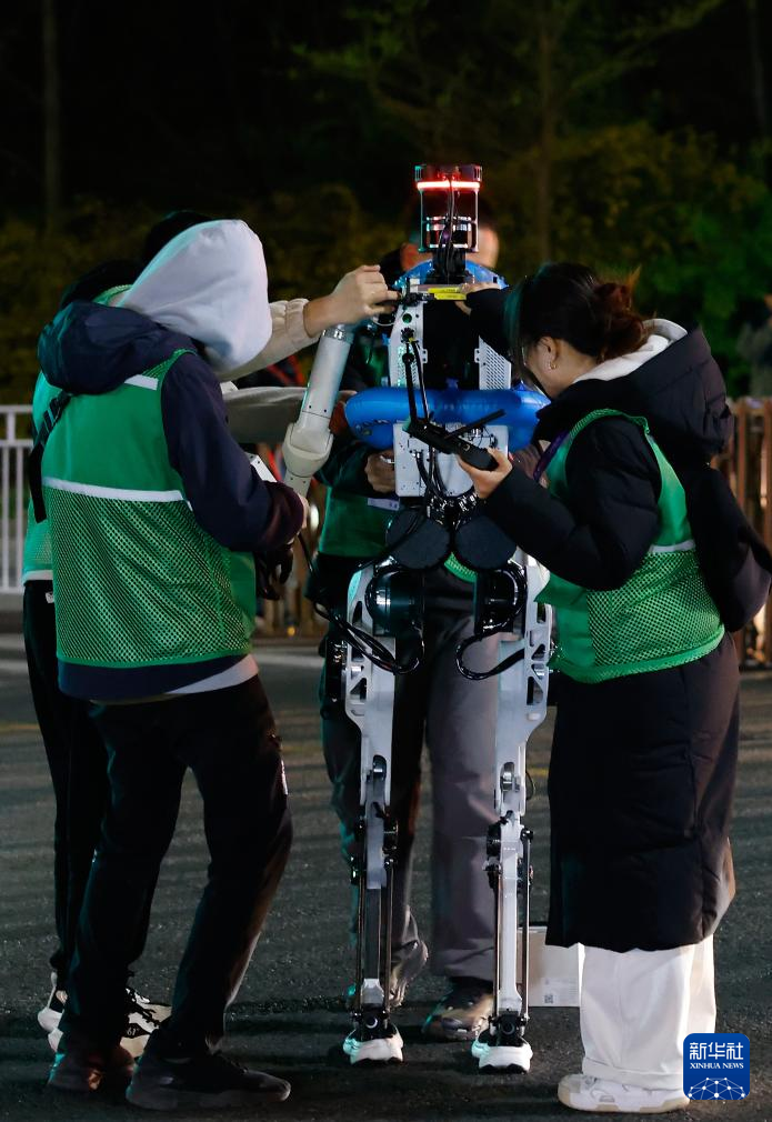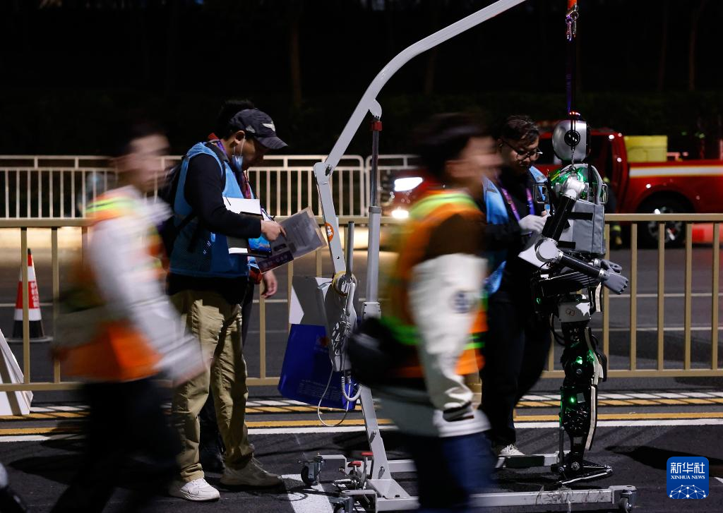 4月12日凌晨,操作人员在调试一台参加全要素测试的机器人。