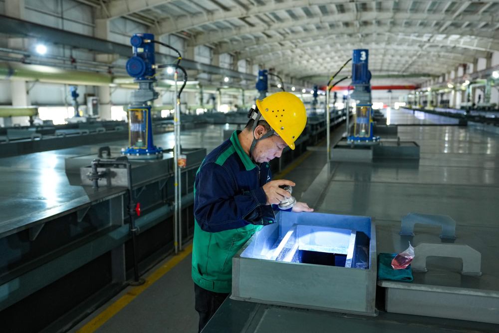 4月14日,在金川集团永昌铜业有限公司精炼分厂,受板机器人在进行剥片作业。新华社记者 郎兵兵 摄