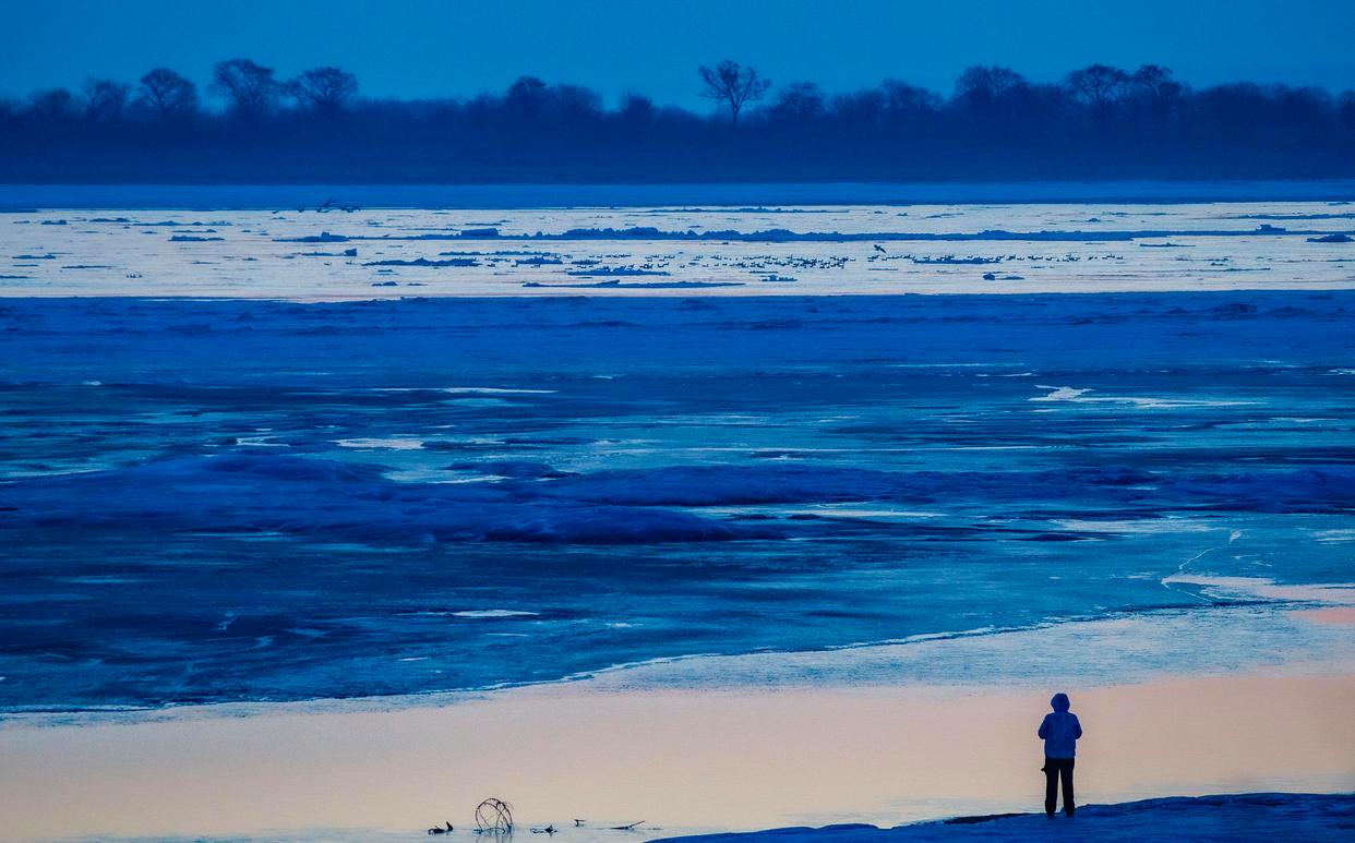 4月14日晨,在黑龙江干流嘉荫段,流冰与飞鸟相映成趣。新华社发(李绍军摄)