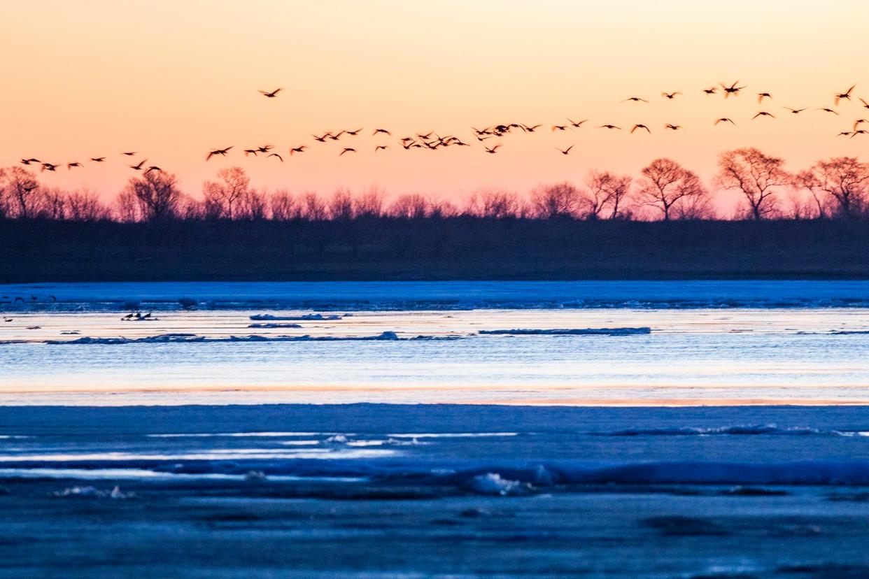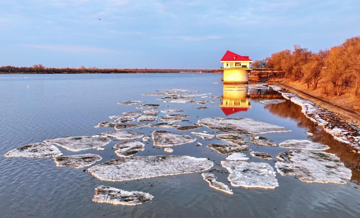 4月14日,在黑龙江干流嘉荫段,朝阳下的流冰与飞鸟相映成趣。新华社发(李绍军摄)