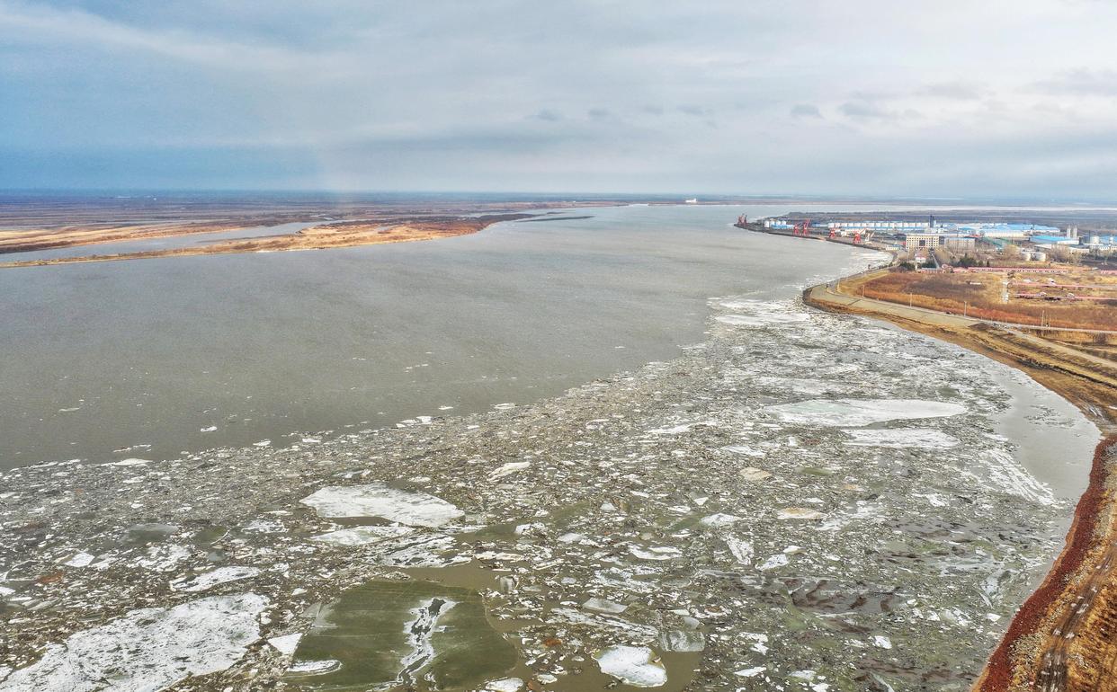 这是4月13日在松花江干流同江段拍摄的流冰景观(无人机照片)。新华社发(刘万平摄)浩荡的冰排
