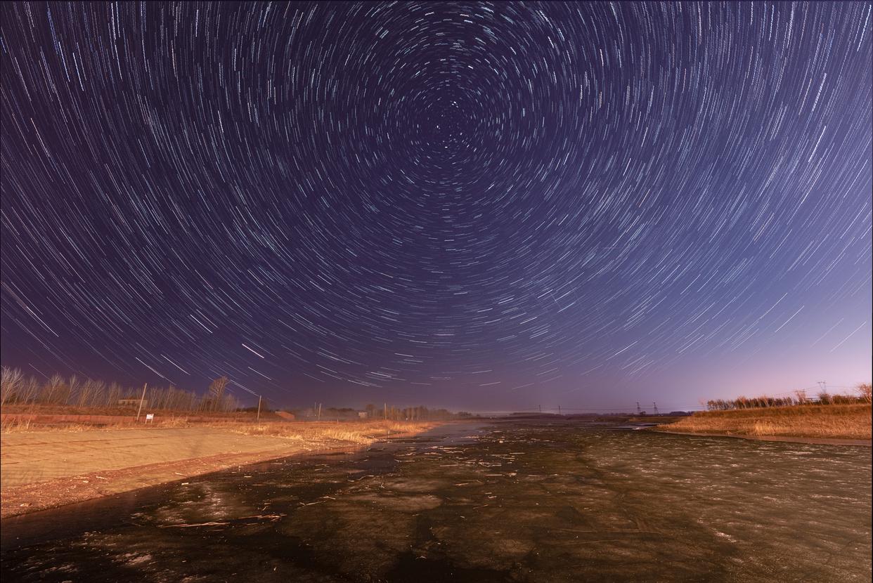 这是4月14日在松花江哈尔滨段一处水域拍摄的星空下的流冰景观(堆栈合成照片)。新华社发(刘大鹏摄)