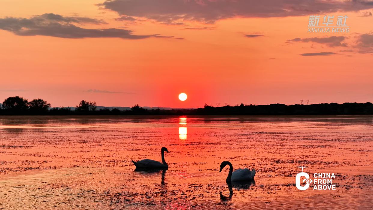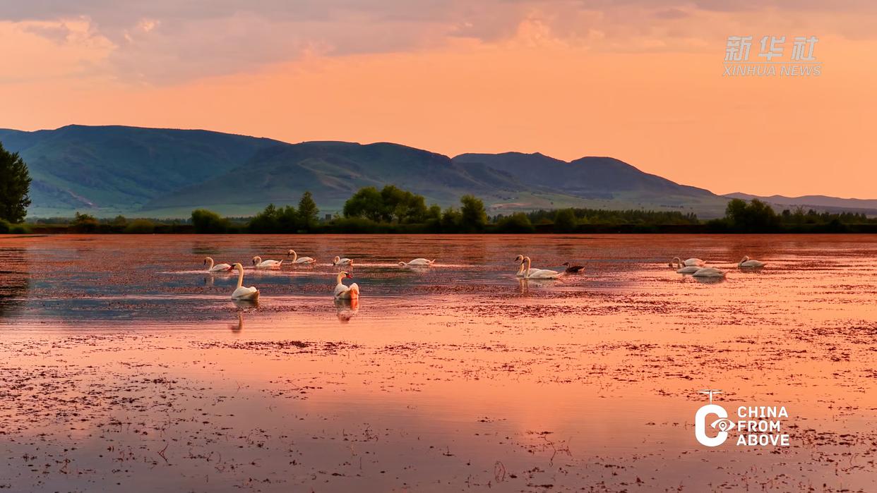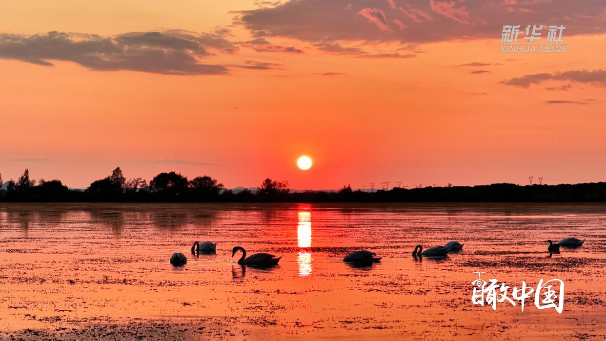 日落时分,在内蒙古自治区兴安盟科尔沁右翼中旗代钦塔拉苏木,澄澈的湖水倒映着远山与霞光,水天之间一片祥和。