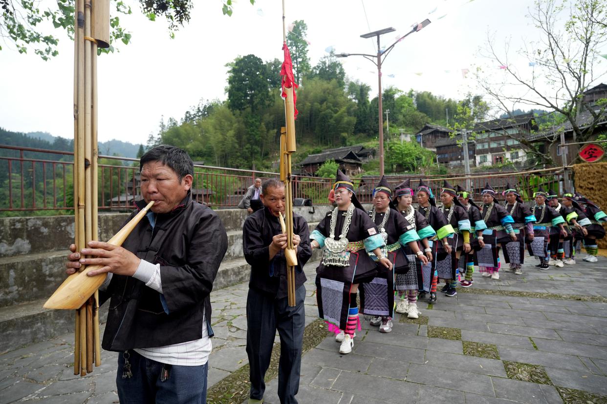 4月19日,在贵州省榕江县两汪乡空申苗寨,苗族群众跳芦笙舞欢度“三月三”。新华社发(王炳真 摄)