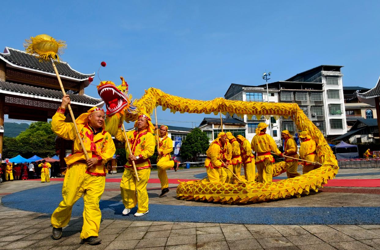 4月19日,在广西柳州市融安县板榄镇欢歌广场举行的“三月三”活动上,民间艺人表演舞龙。新华社发(谭克兴 摄)