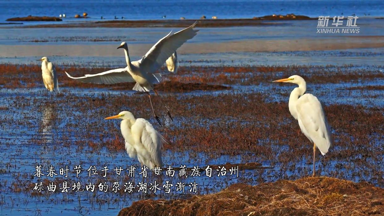 暮春时节,位于甘肃省甘南藏族自治州碌曲县境内的尕海湖冰雪渐消。随着天气逐渐变暖,大批白鹭在此栖居,它们时而优雅地在湖面觅食、时而振翅高飞,灵动的身姿为高原湖泊增添了无限生机。