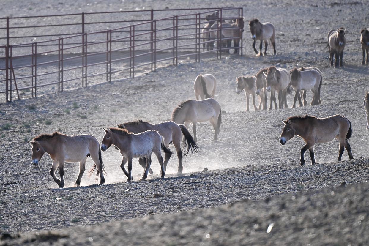 在新疆卡拉麦里山有蹄类野生动物自然保护区,野放的普氏野马冲出围栏(4月22日摄)。新华社记者 丁磊 摄
