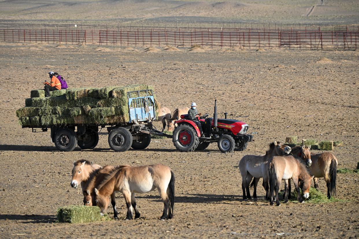 在新疆卡拉麦里山有蹄类野生动物自然保护区,工作人员为普氏野马投放草料(4月21日摄)。新华社记者 丁磊 摄