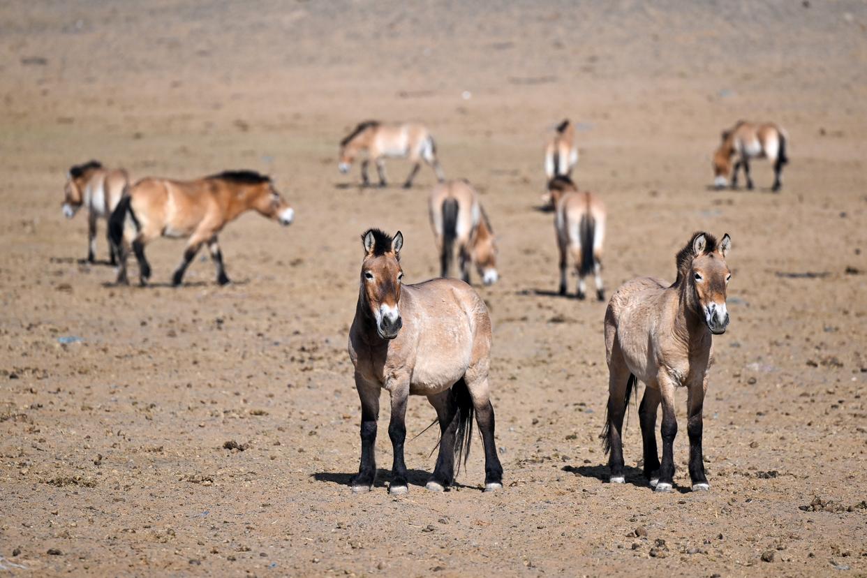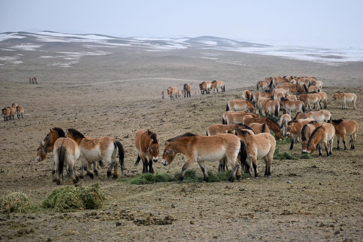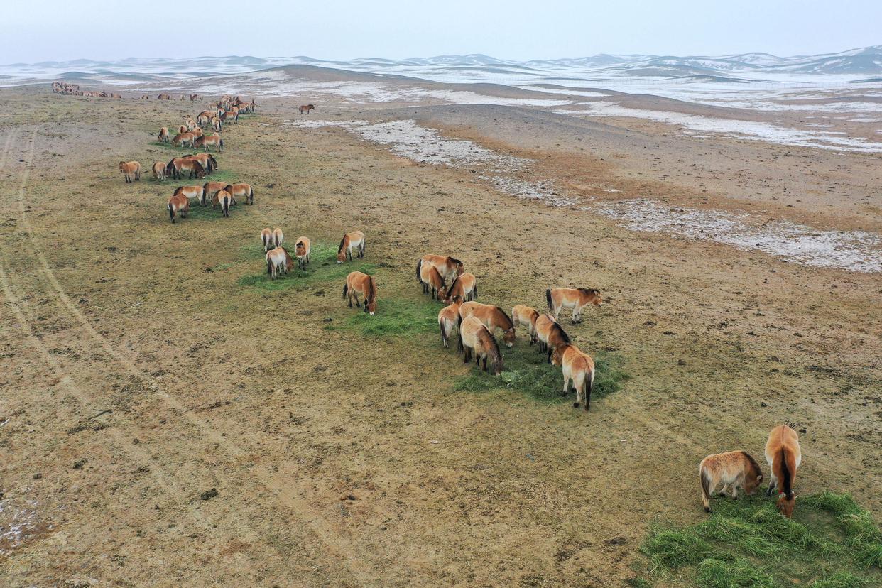 等待野放的普氏野马经过一个冬季的适应,以及种群内的自由竞争,逐渐形成新的稳定群体(4月21日摄)。新华社记者 丁磊 摄