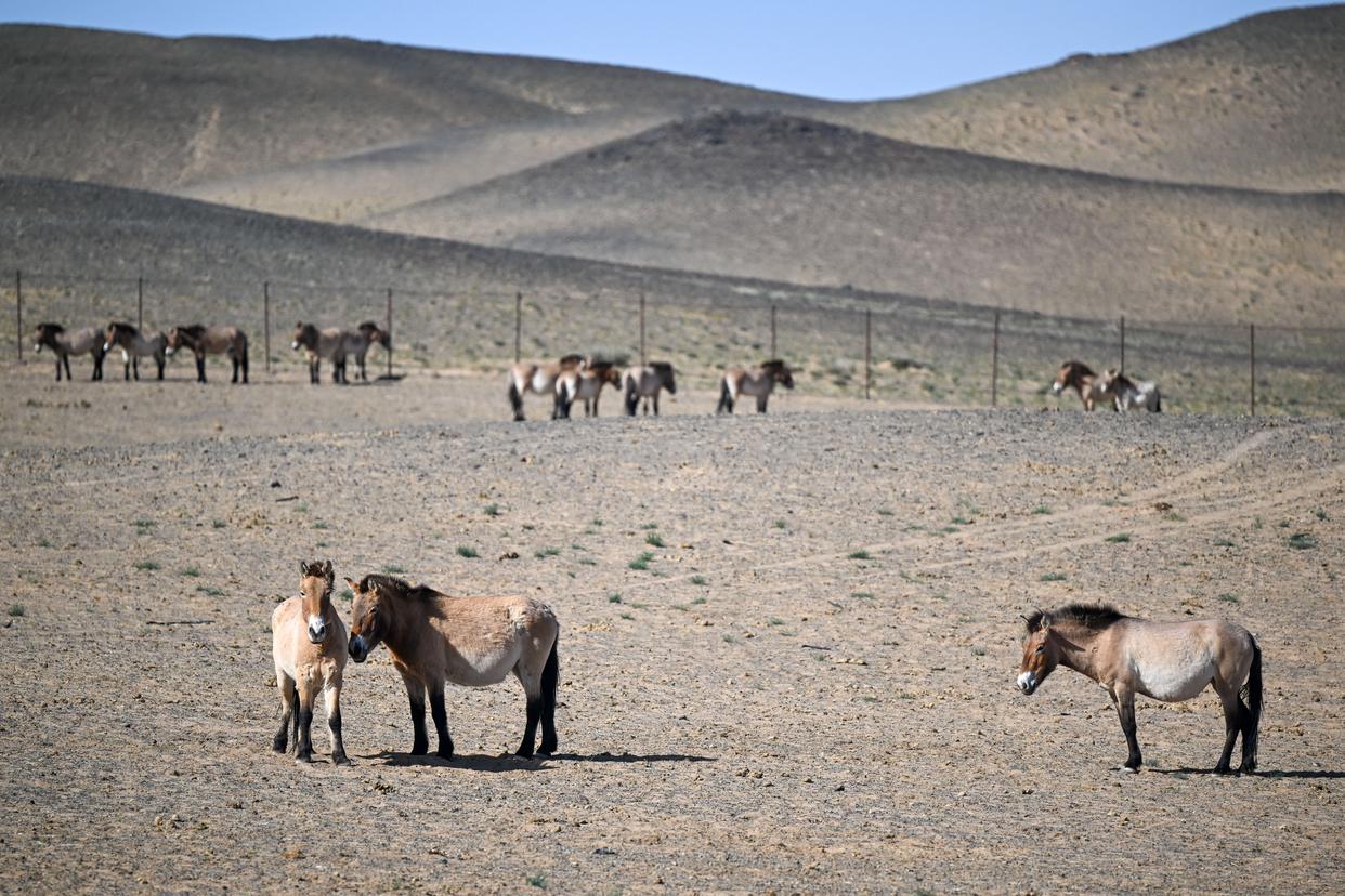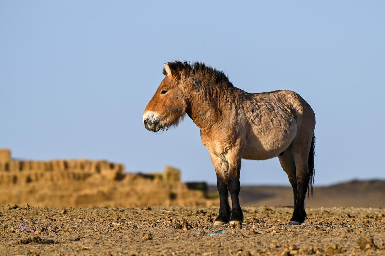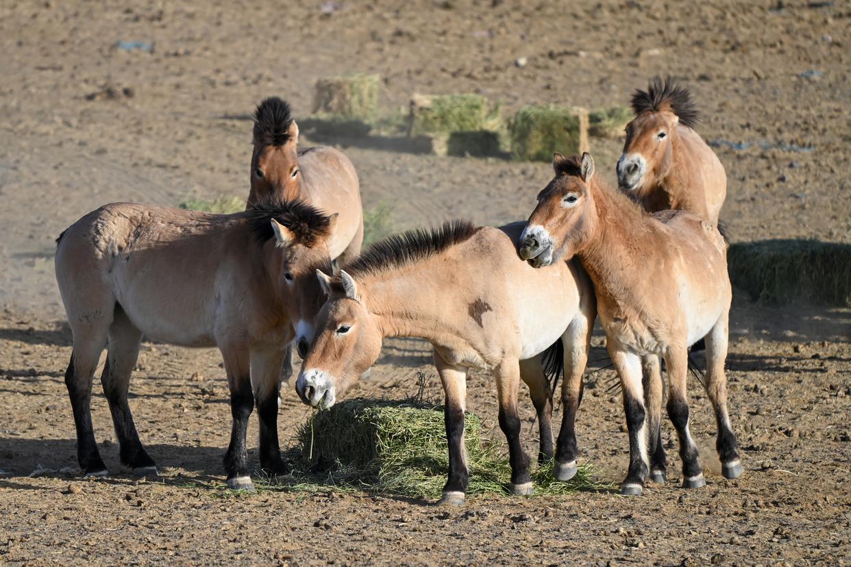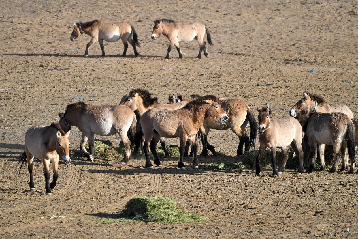 等待野放的普氏野马经过一个冬季的适应,以及种群内的自由竞争,逐渐形成新的稳定群体(4月21日摄)。新华社记者 丁磊 摄