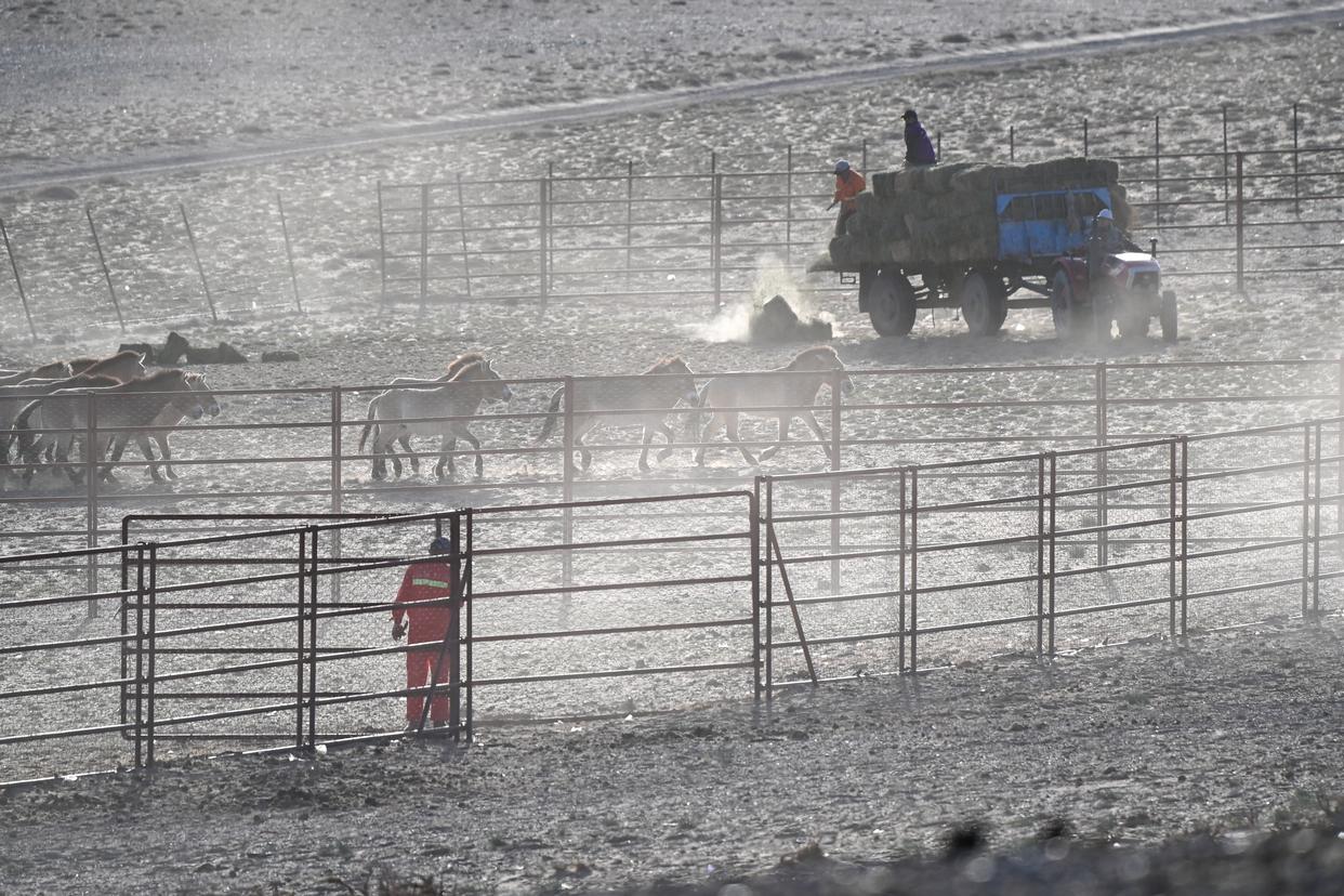 在新疆卡拉麦里山有蹄类野生动物自然保护区,工作人员投放草料将即将野放的普氏野马分群(4月21日摄)。新华社记者 丁磊 摄
