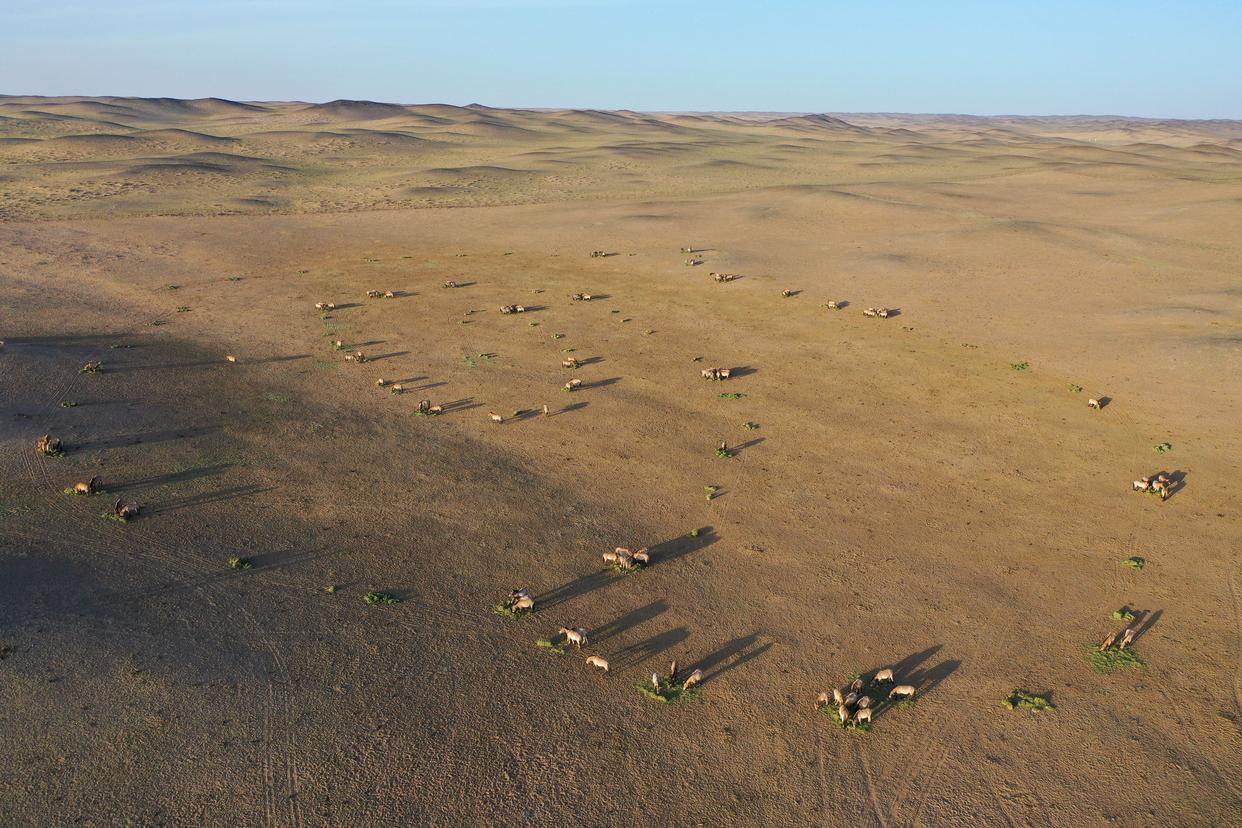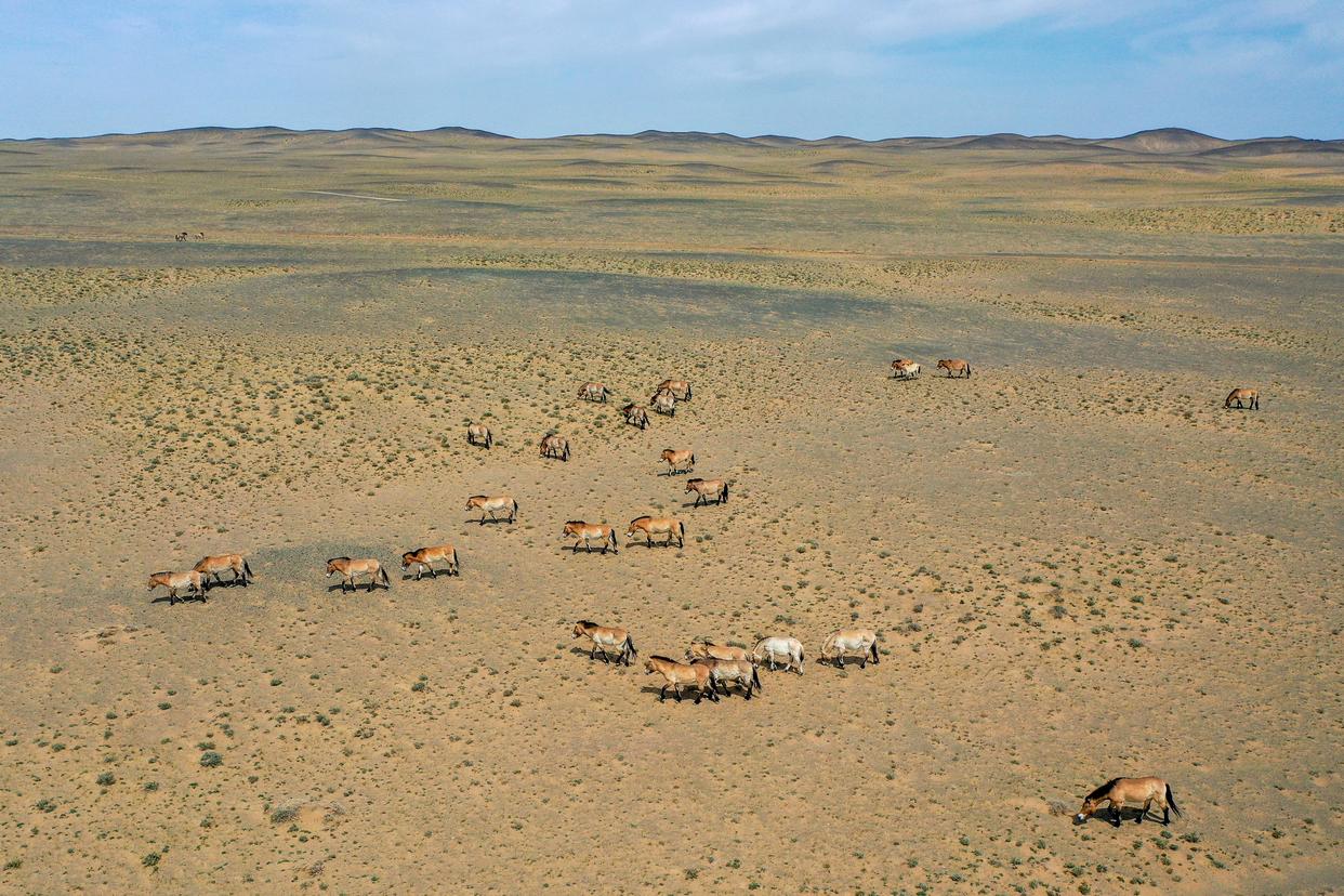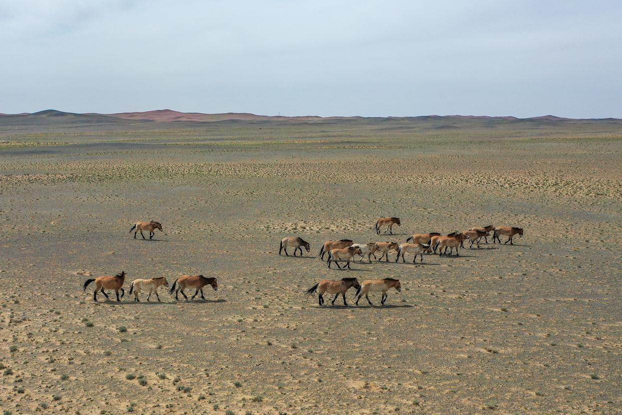 这是在新疆卡拉麦里山有蹄类野生动物自然保护区拍摄的回归野外的普氏野马(4月22日摄,无人机照片)。 新华社记者 丁磊 摄