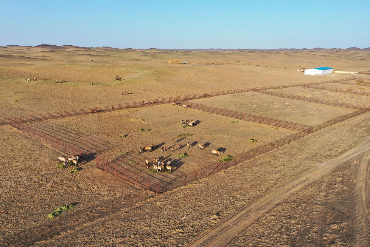 在新疆卡拉麦里山有蹄类野生动物自然保护区乔木希拜普氏野马监测站,等待野放的普氏野马在分群围栏中(4月21日摄,无人机照片)。新华社记者 丁磊 摄