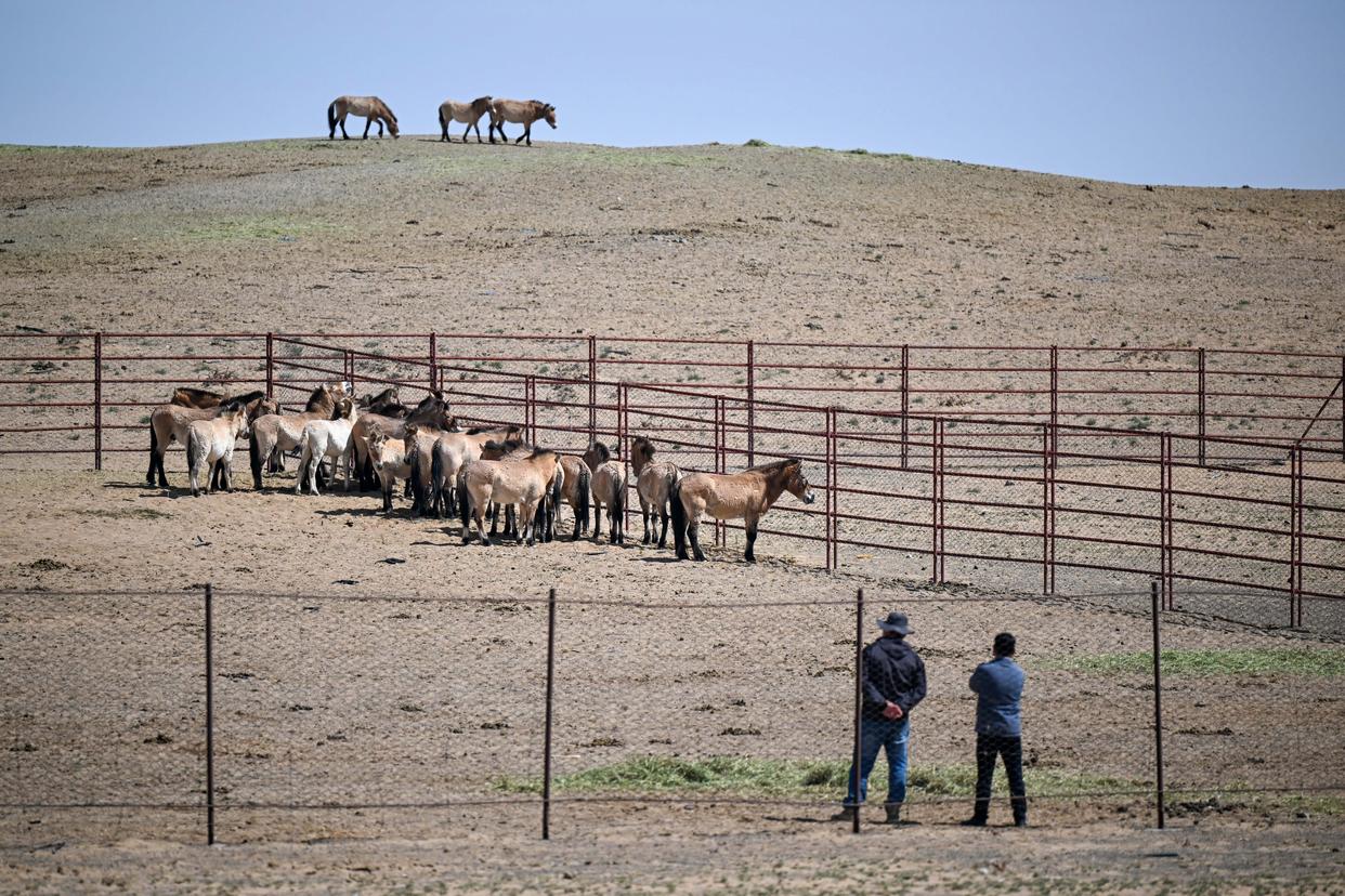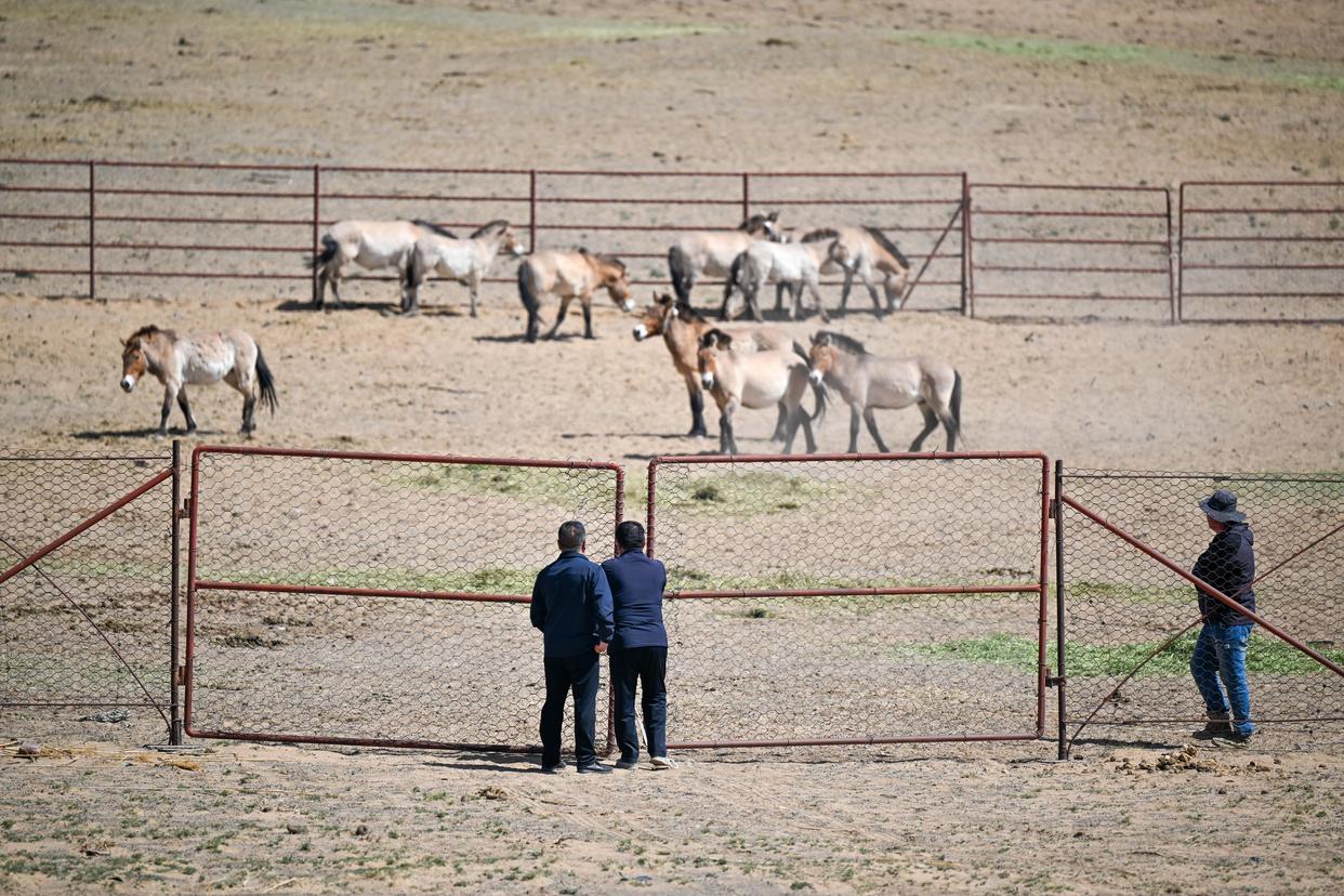 在新疆卡拉麦里山有蹄类野生动物自然保护区,工作人员在观察即将野放的普氏野马状态(4月22日摄)。新华社记者 丁磊 摄