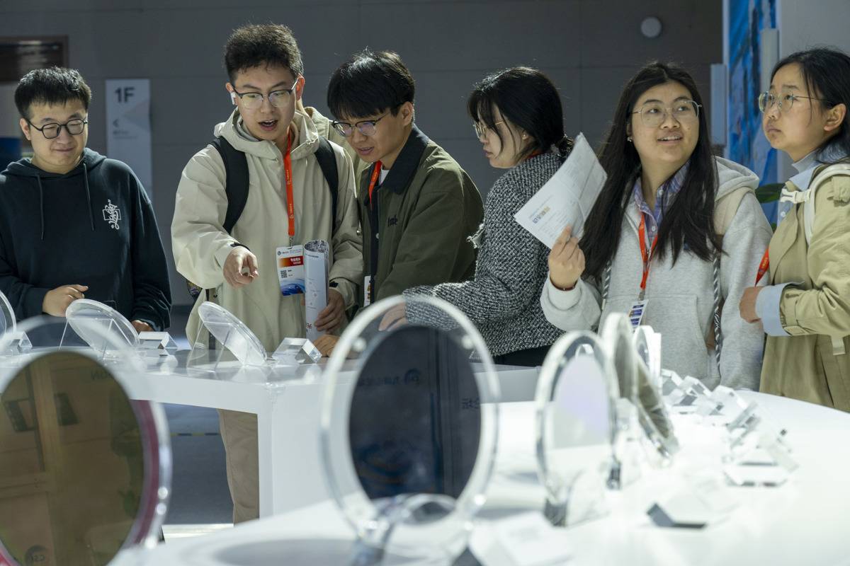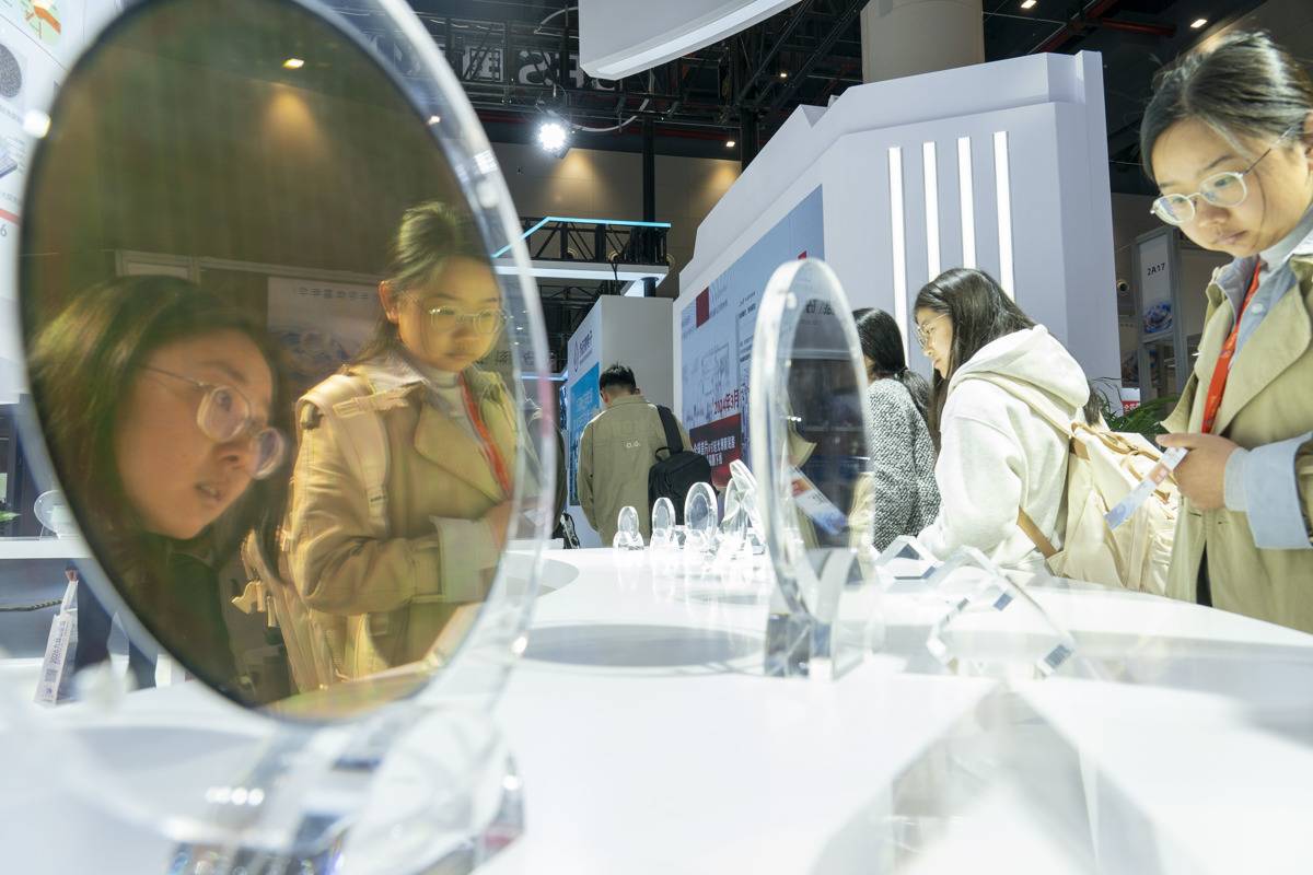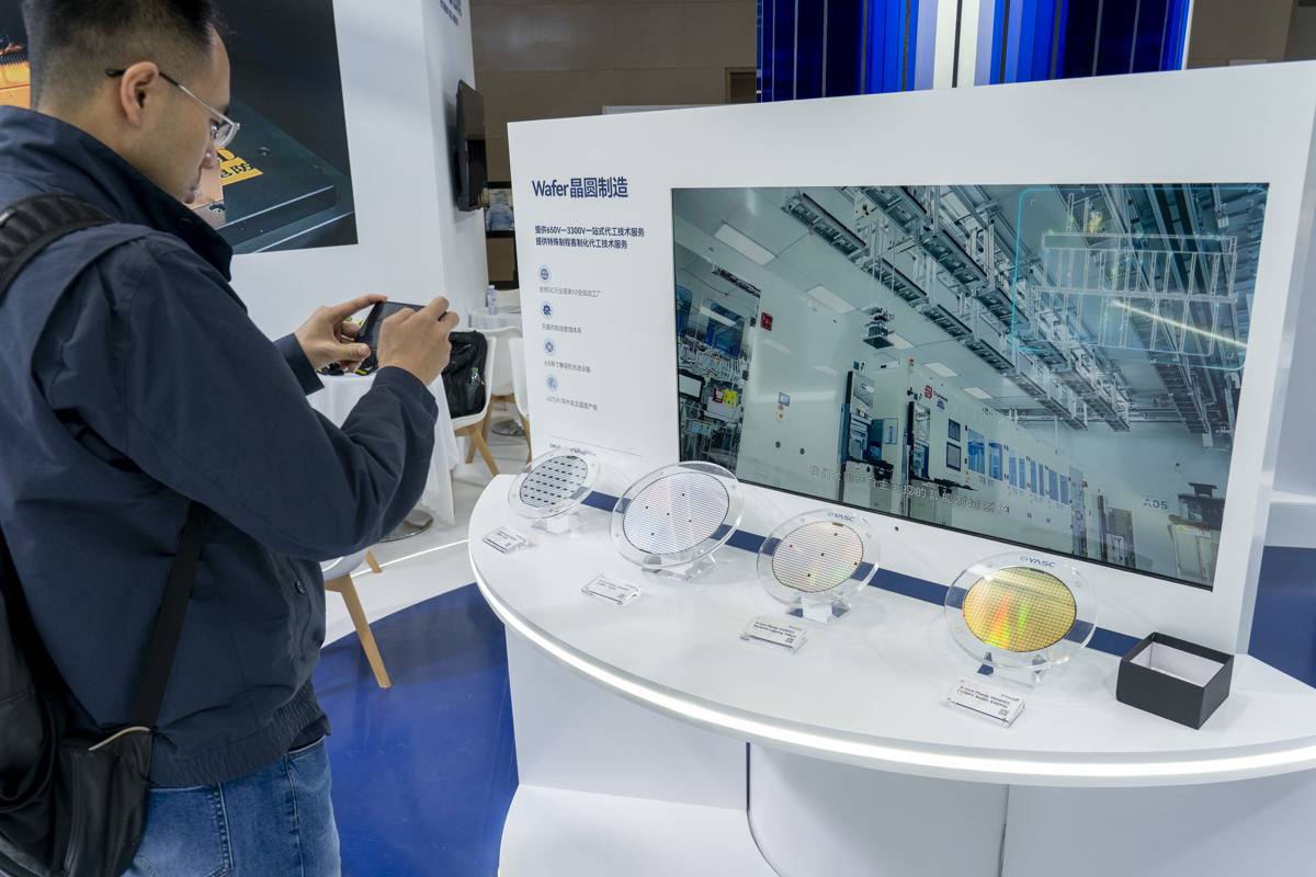 长飞先进展台,观众参观新型晶圆产品。