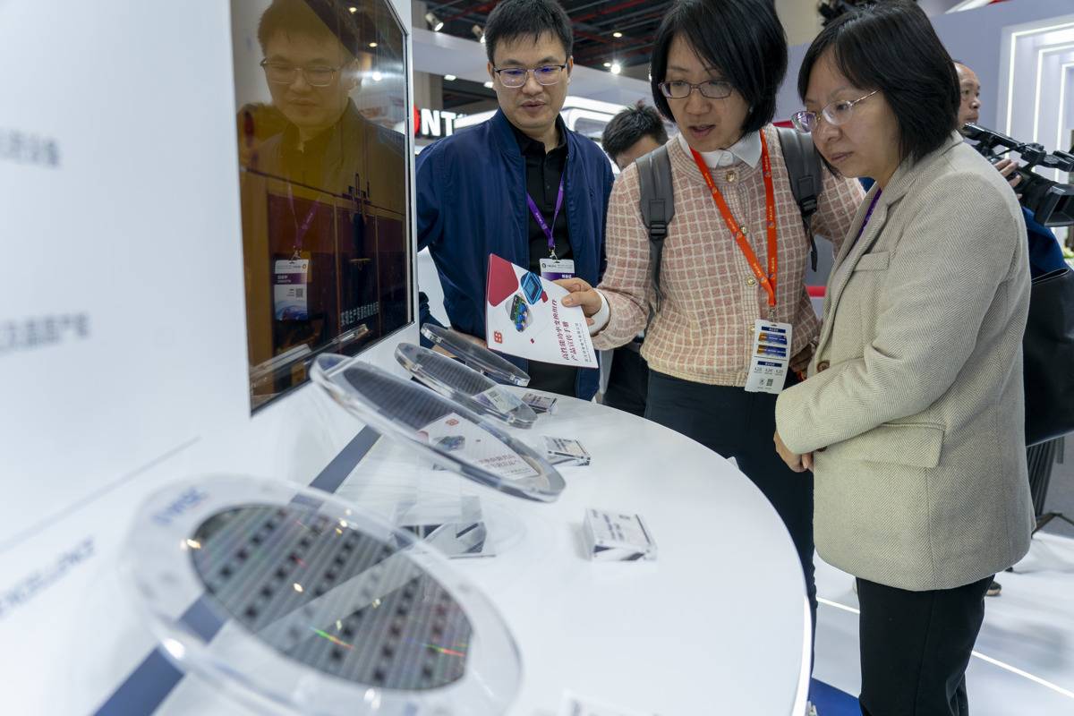 九峰山实验展台,观众参观新型化合物半导体晶圆。