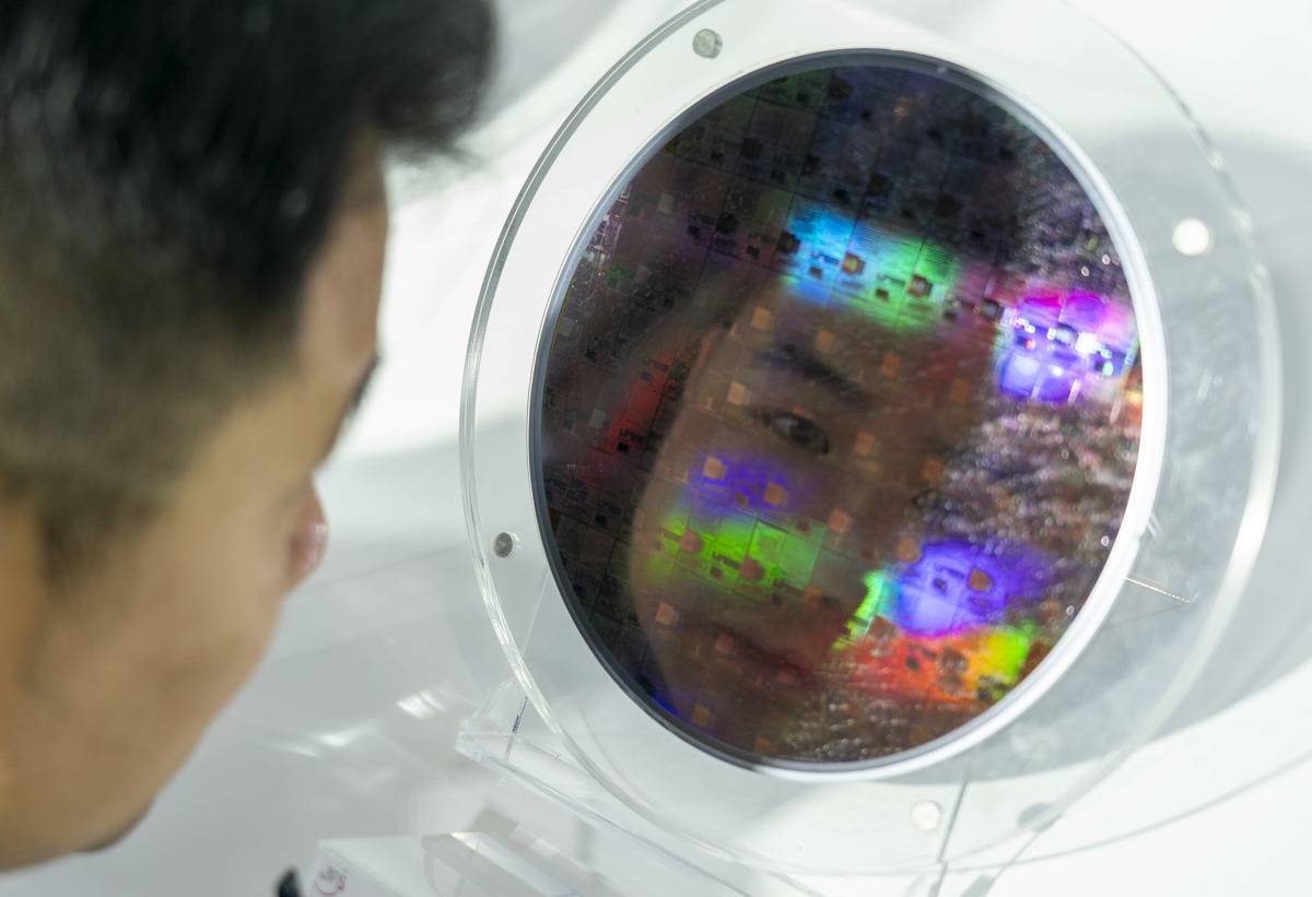 九峰山实验展台,一位观众仔细参观新型化合物半导体晶圆。