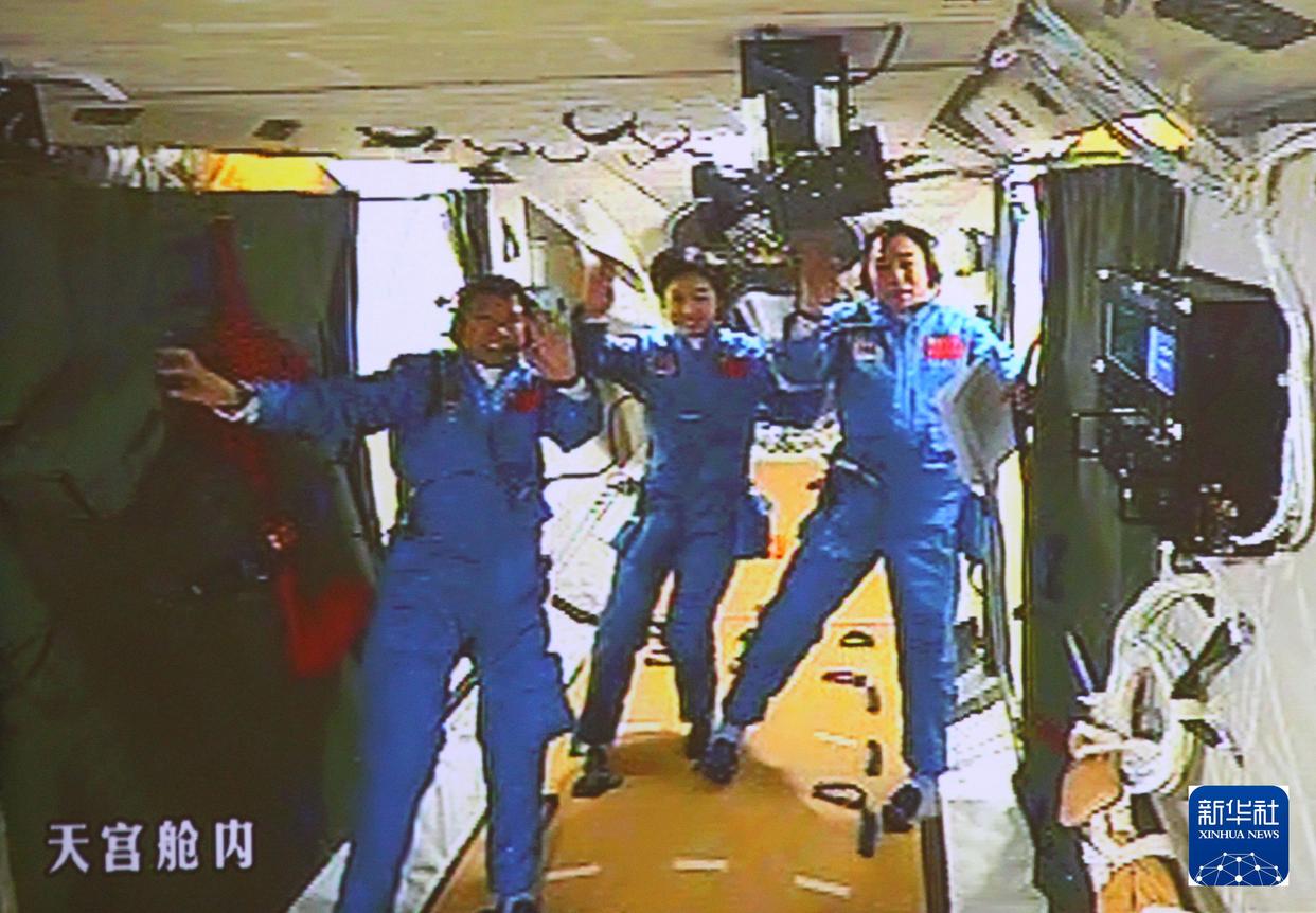2012年6月18日,北京航天飞控中心大屏幕显示航天员景海鹏、刘洋、刘旺(从右至左)在天宫一号实验舱内。新华社记者 查春明 摄