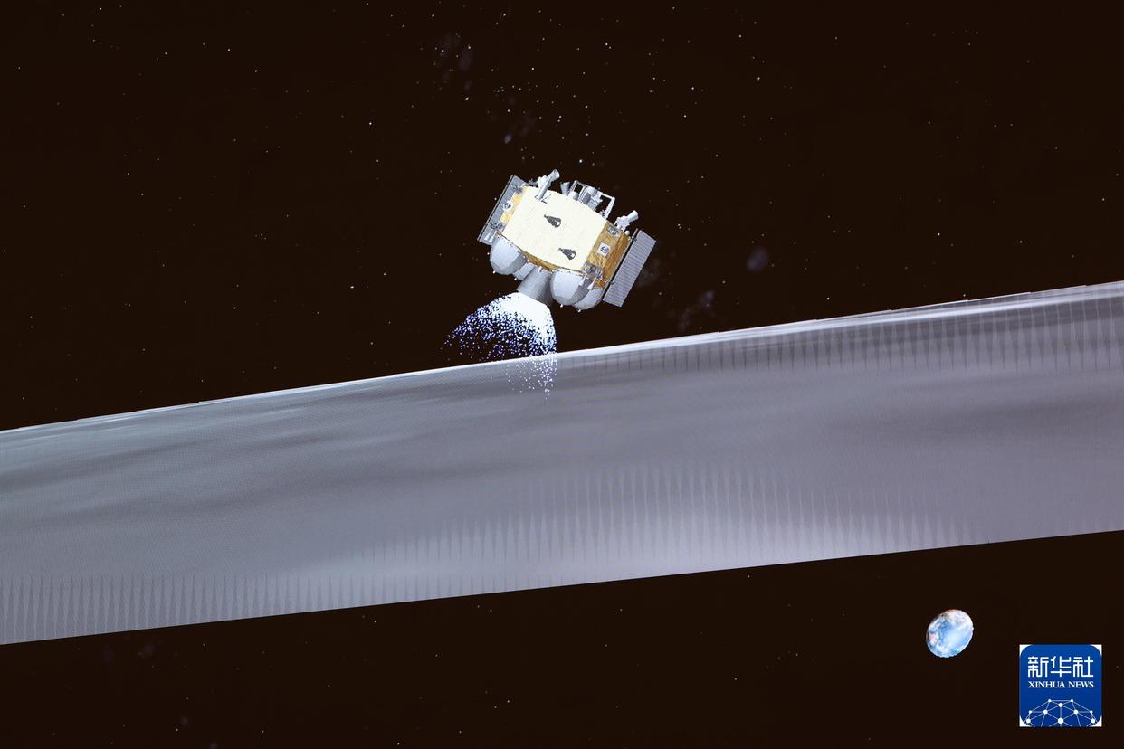 2024年6月4日在北京航天飞行控制中心屏幕上拍摄的嫦娥六号上升器携带月球样品自月球背面起飞的动画模拟画面。新华社记者 金立旺 摄