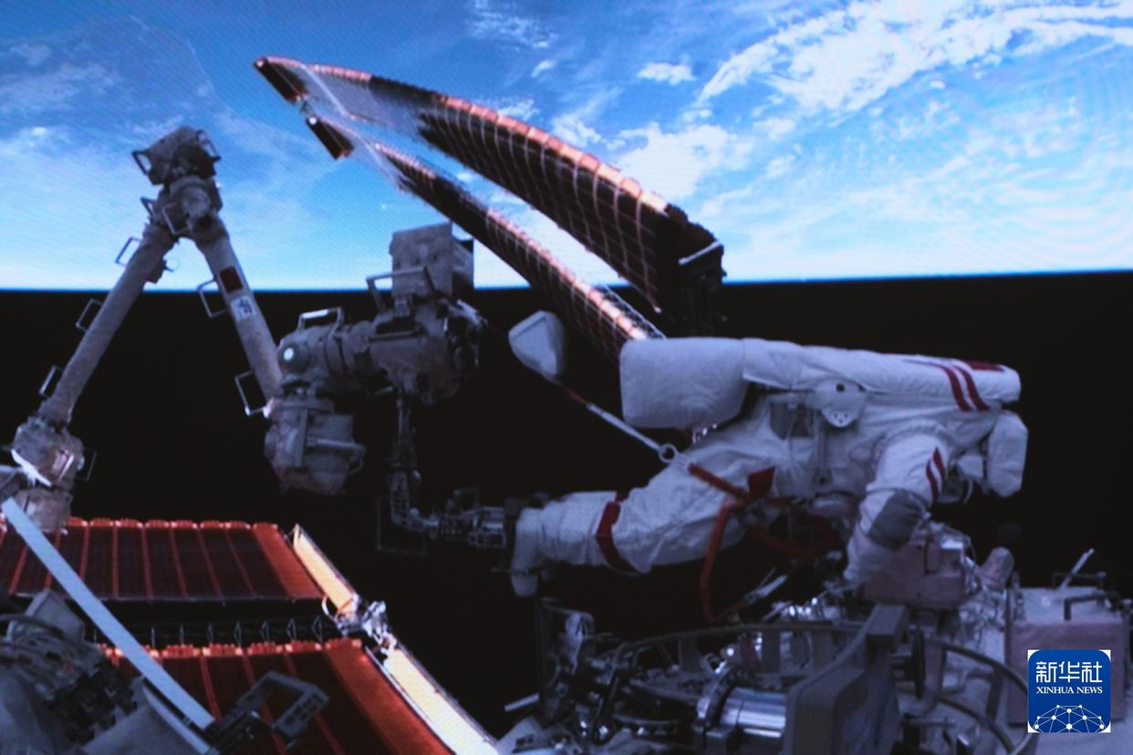 2025年12月9日18时45分,经过约8小时的出舱活动,神舟二十一号乘组航天员张陆、武飞、张洪章密切协同,圆满完成第一次出舱活动,完成了神舟二十号飞船返回舱舷窗巡检拍照等任务。这是12月9日在北京航天飞行控制中心屏幕上拍摄的神舟二十一号乘组航天员张陆与武飞(右)在舱外工作的画面。新华社记者 刘艺 摄